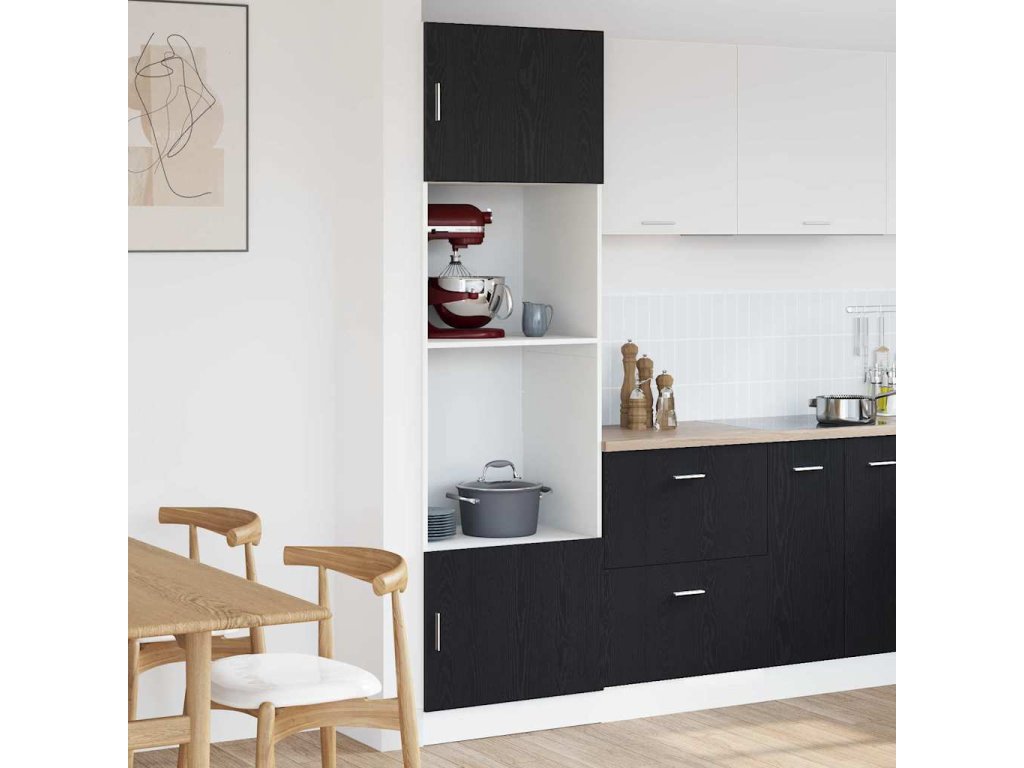 - Komponenty: Skříň má hezky zpracovaný zadní panel, což ji dělá flexibilní pro různé kuchyňské uspořádání. Práce s kompozitním dřevem po celém povrchu zaručuje, že každý prvek je silný a spolehlivý pro každodenní použití.