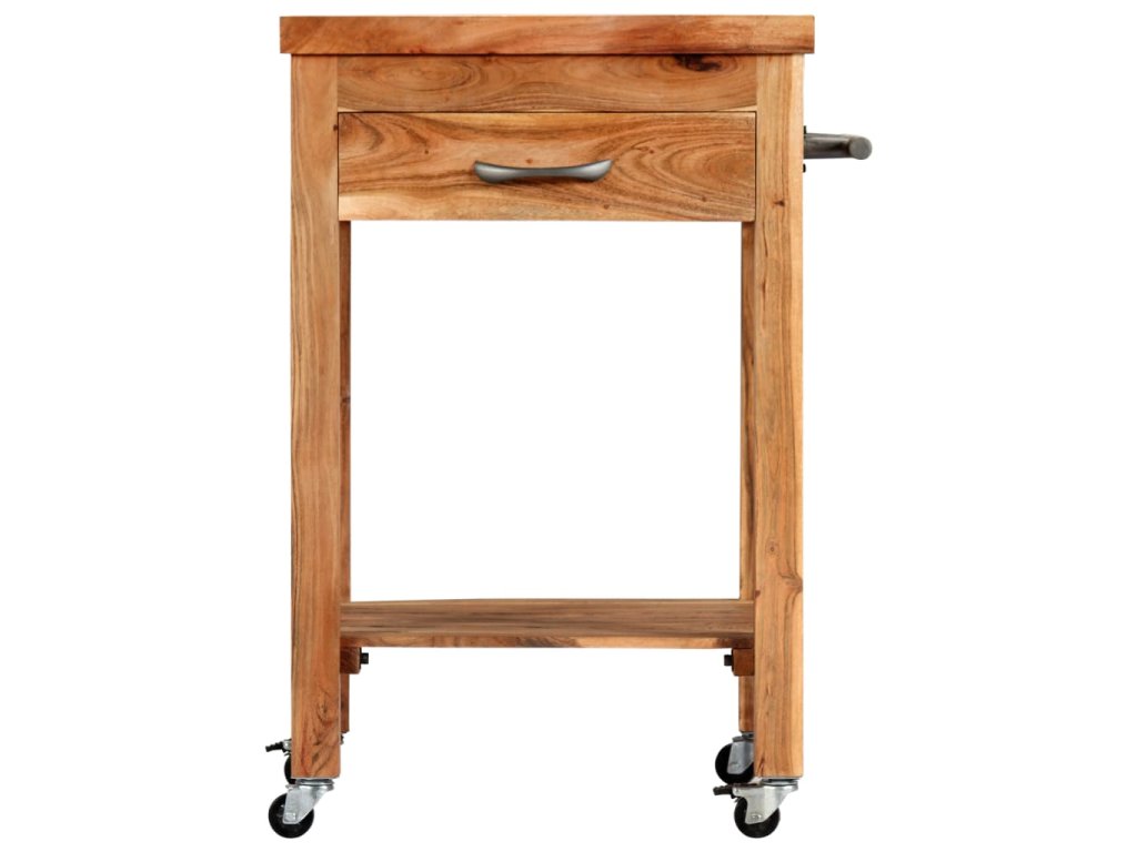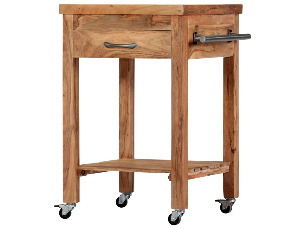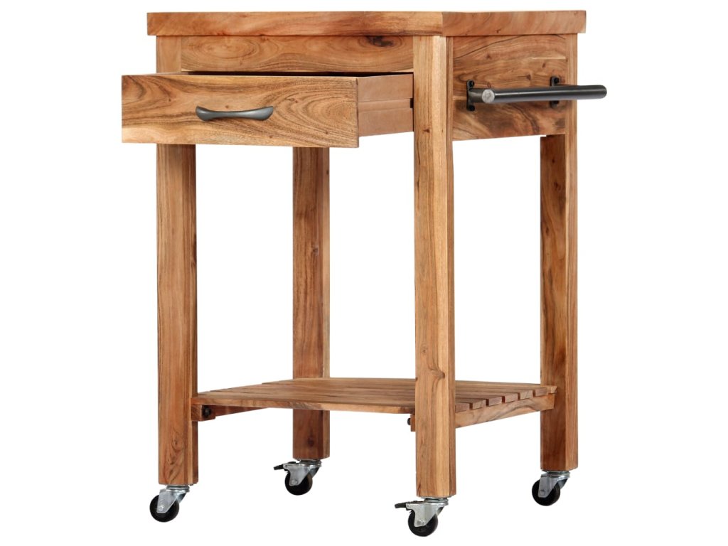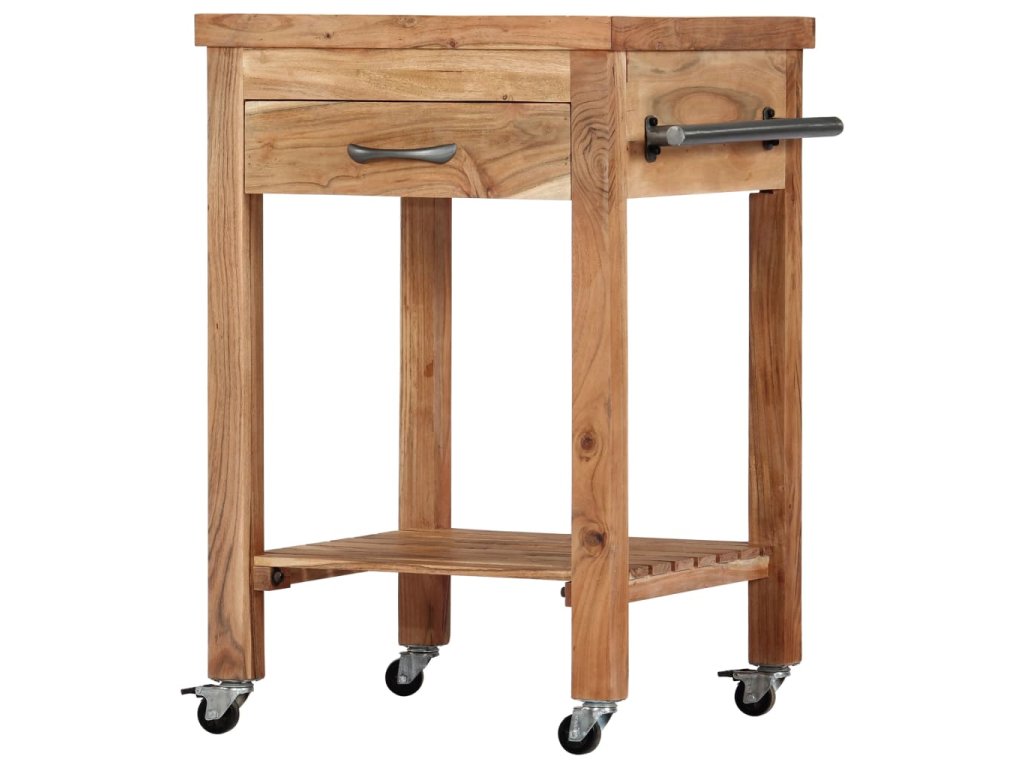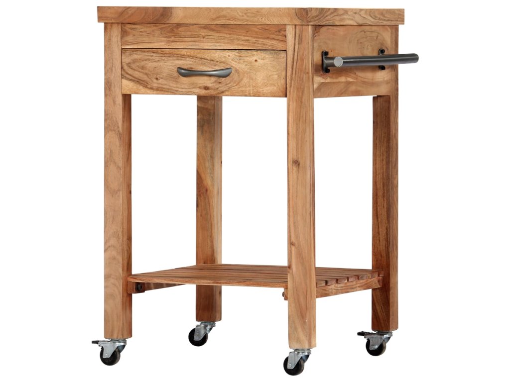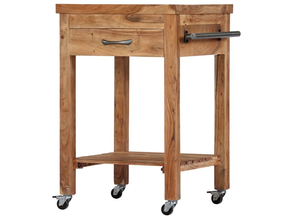 Kuchyňský vozík je vyrobený z akáciového dřeva, které se vyznačuje svou pevností a tvrdostí, a to mu ve spojení s jeho přírodní povrchovou úpravou zaručuje mimořádnou stabilitu a odolnost. Pro hladké přesouvání je opatřen 4 kolečky, z nichž 2 lze zabrzdit. Snadno ho tedy převezete z místa na místo a tam ho kdykoli zabrzdíte a bezpečně zaparkujete. Zásuvka a spodní polička vám navíc poskytnou spoustu místa, kam si můžete položit stojany na láhve, kuchařky a nejrůznější kuchyňské náčiní. Po straně najdete také věšák na utěrky, takže je budete mít vždy po ruce.