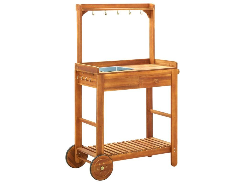 Zahradní kuchyňský stolek je vyroben z masivního akáciového dřeva, což je tropické tvrdé dřevo, které je odolné vůči klimatickým vlivům a vysoce odolné. Tento dřevěný servírovací vozík vnese na vaši zahradu či do bytu trochu rustikálního kouzla.