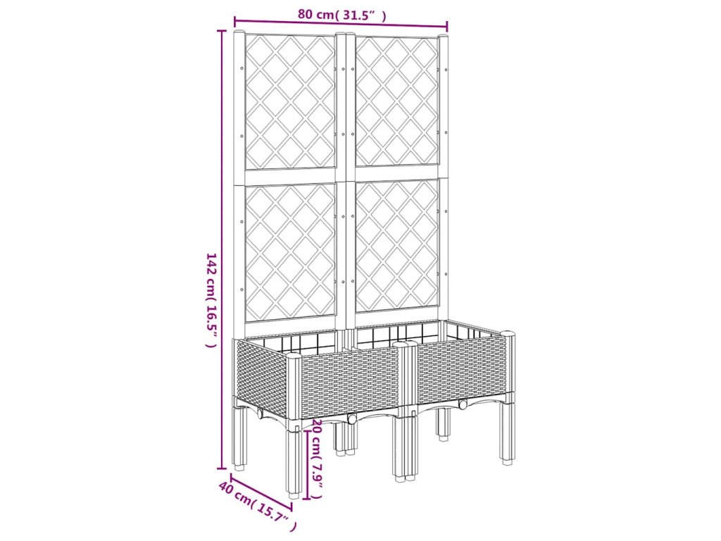 - Praktický design: Ideální dno pomáhá zadržovat vlhkost a umožňuje snadný odvod vody. Vestavěná treláž navíc nabízí oporu pro růst popínavých rostlin, jako jsou rajčata, hrášek nebo růže.