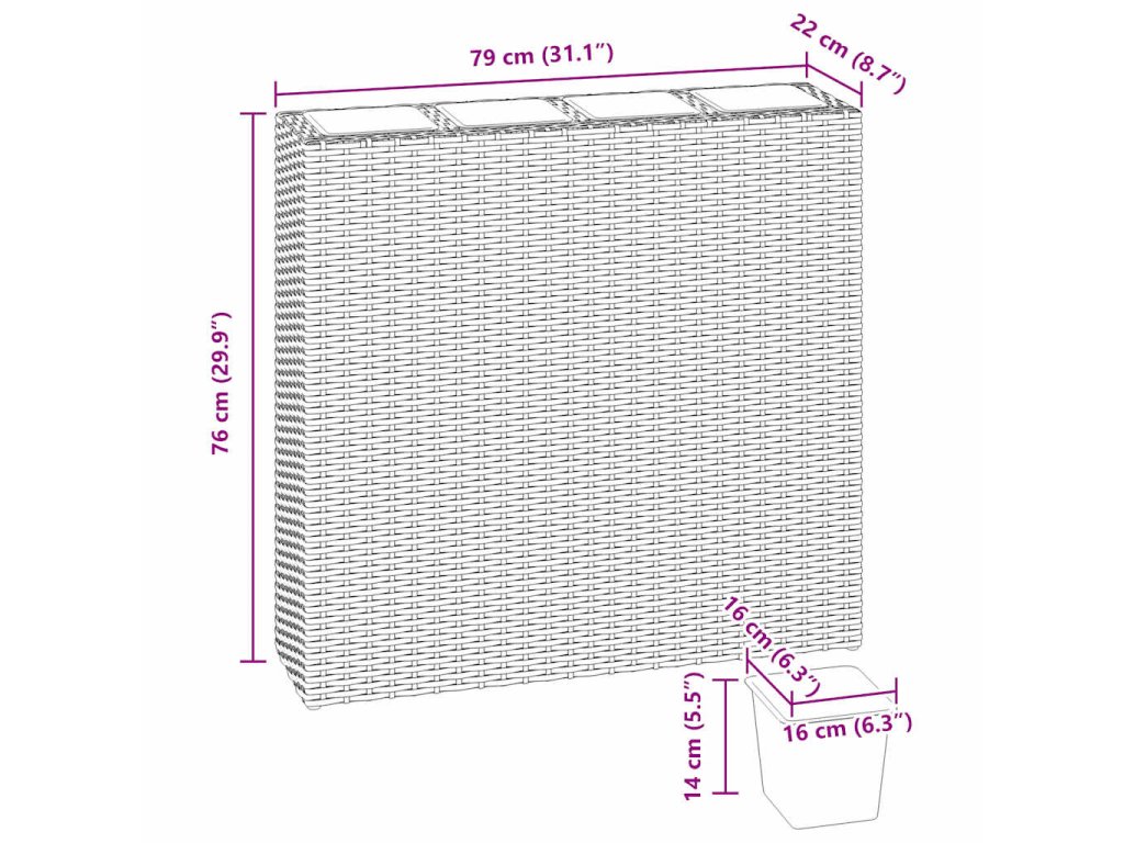 Truhlík je vyrobený z trvanlivého a voděodolného ratanu a bude se na vaší zahradně skvěle vyjímat. Těsně pletená struktura vytváří hladký povrch a zároveň zaručuje výtečnou stabilitu. Uvnitř ratanového truhlíku se nachází 4 plastové květináče. Jelikož je každý díl vyrobený z kvalitního materiálu, celá sada má velmi dlouhou životnost. Můžete v ní pěstovat všechny druhy živých zelených rostlin i květin.