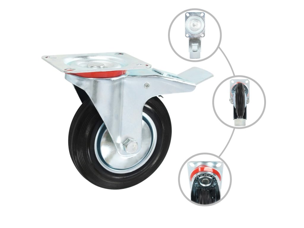 Kolečka jsou vyrobená z gumy, která je známá pro svou schopnost pohlcovat nárazy a vibrace. Ať už tedy kolečka namontujete na cokoliv, budete to moci přesouvat hladce a v tichosti. Jejich hladký povrch navíc ochrání vaši podlahu před poškrábáním. Zinkem potažený ocelový rám je odolný proti rzi, a tudíž kolečkům dodává na odolnosti a prodlužuje jejich životnost. Polovina těchto otočných koleček je vybavená dvojitou brzdou pro flexibilnější ovládání. Každé kolečko má maximální nosnost až 150 kg.
