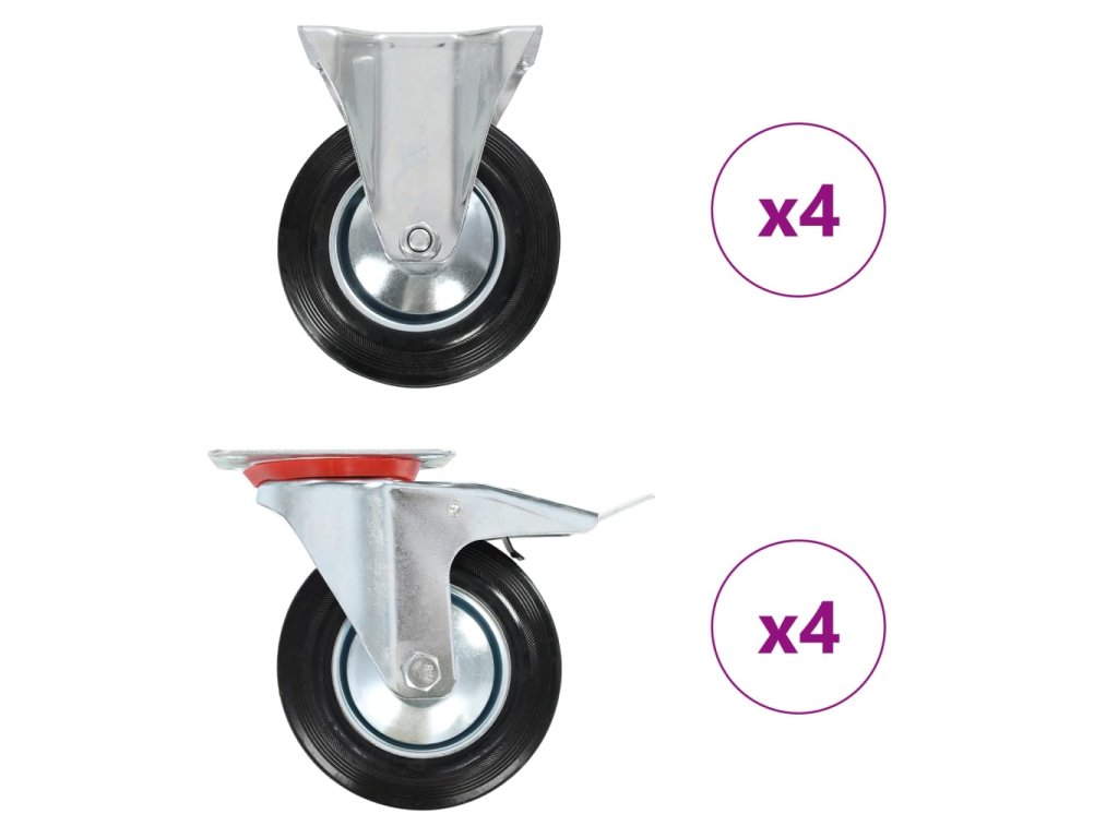 - Balení obsahuje 4 pevná kolečka a 4 otočná kolečka s brzdou