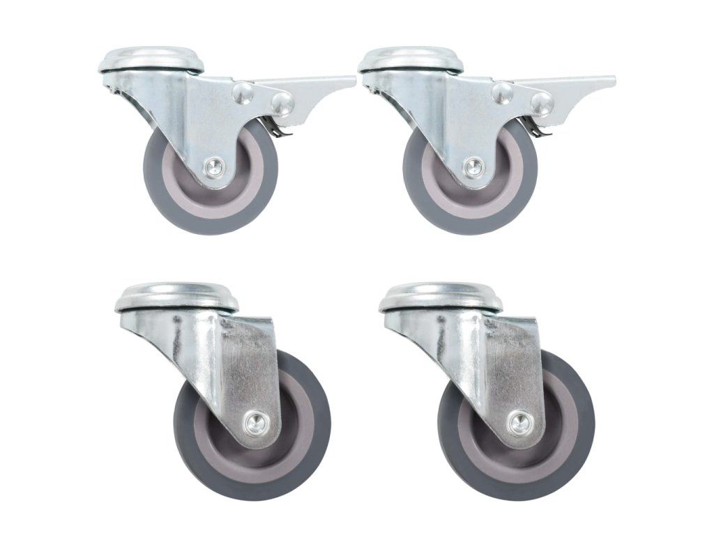 Balení obsahuje 2 otočná kolečka s otvorem pro šroub a 2 otočná kolečka s otvorem pro šroub a dvojitou brzdou.