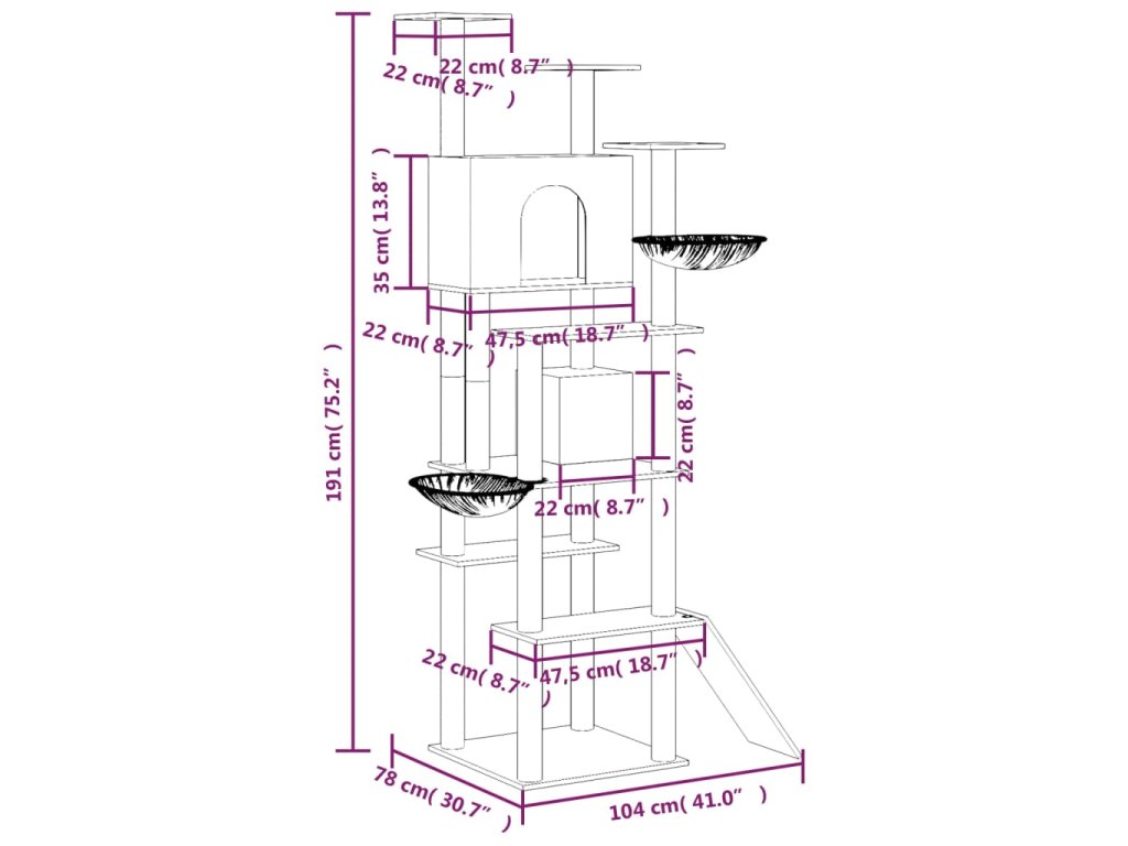 - Všestranná kočičí věž: Víceúrovňová škrabací věž pro kočky poskytuje kočce zábavu a kompaktní místo na hraní a dovádění a teplý pelíšek pro klidné zdřímnutí. Disponuje žebříkem, 2 domečky, 2 hamakami a plošinami.