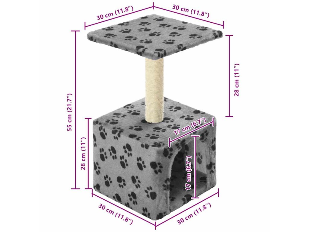 Plyšovým kobercem pokrytý povrch je velmi pohodlný a sloupek škrabadla je obalený sisalovým provázkem. Škrabadlo má pohodlný domeček a plošinu na pozorování okolí, aby udrželo vaše kočky stále zabavené. Podstavec je robustní a stabilní. Je vhodné pro koťata.