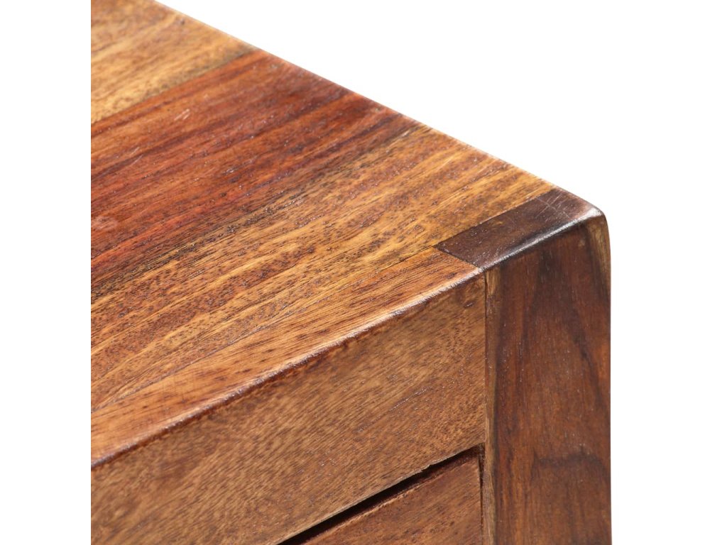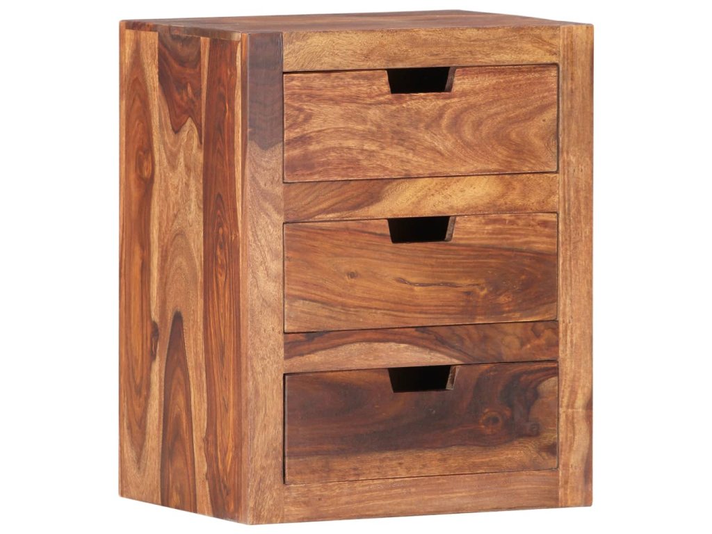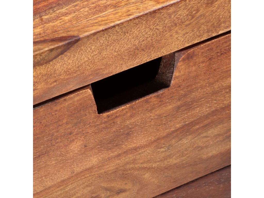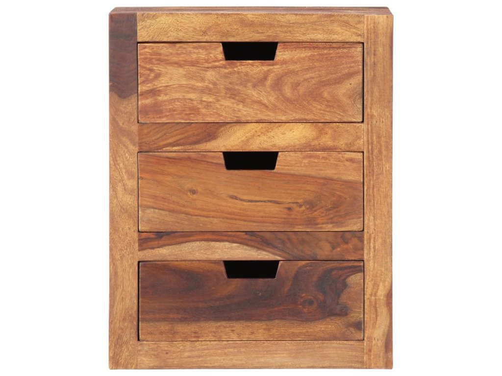 Tento odolný noční stolek je zhotovený z masivního akáciového dřeva se světle hnědou povrchovou úpravou a vyzařuje z něj vintage kouzlo. Akácie, také známý jako rosewood nebo palisandr, je tropické tvrdé dřevo oceňované pro svou bohatou kresbu. Akáciové dřevo bylo vyleštěno, natřeno a nalakováno, a tak získalo krásnou povrchovou úpravu, čemuž tento noční stolek vděčí za svůj rafinovaný vzhled. 3 zásuvky navíc poskytují prostor pro přehledné uložení menších věcí na dosah ruky.