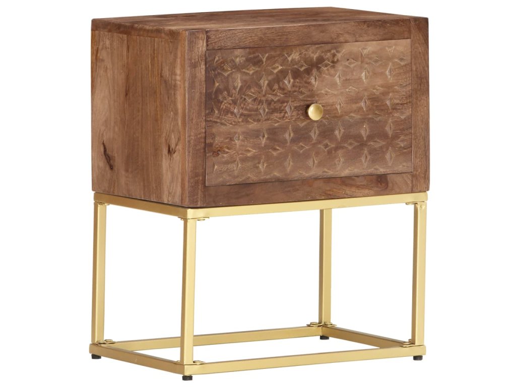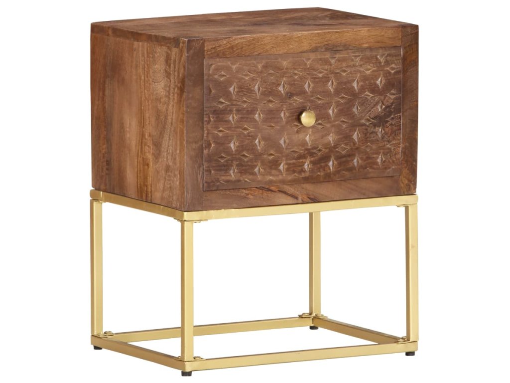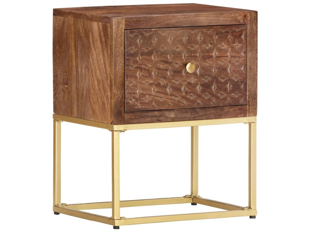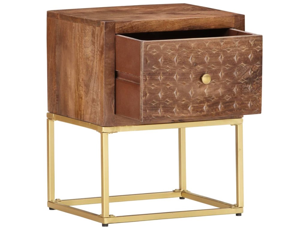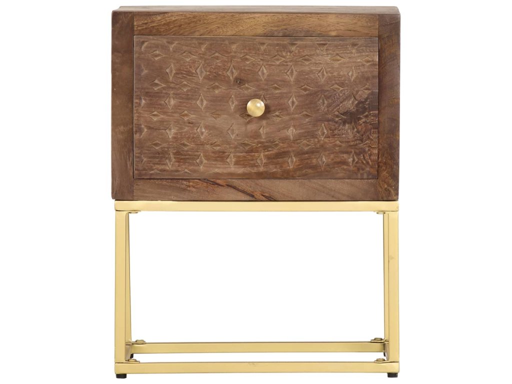 Noční skříňka s ručně vyřezávaným vzorem na čelní straně je zhotovená z masivního mangovníku, což je husté a robustní tvrdé dřevo, jehož povrch se vyznačuje hnědými či zlatými pruhy a konturami. Každá fáze výrobního procesu je prováděná s mimořádnou péčí, ať už se jedná o leštění nebo lakování. Řemeslné zpracování pak podtrhuje působivé retro vzezření nábytku. Krásná kresba dřeva dává každému kusu nábytku jedinečný charakter, jímž se lehce liší od všech ostatních. Práškově lakovaný ocelový rám působí industriálním dojmem. Skříňka má také jednu zásuvku, kde najdete spoustu prostoru k přehlednému uložení všech možných maličkostí na dosah ruky. Sestavení produktu je jednoduché.