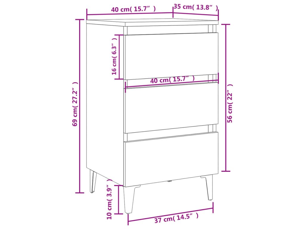 Tento noční stolek se čtyřmi kovovými nohami je velmi stabilní a bytelný. Je navíc vybavený třemi zásuvkami, které nabízejí dostatek úložného prostoru pro přehledné uspořádání vašich věcí, které budete mít po ruce. Snadno se také čistí vlhkým hadříkem.
