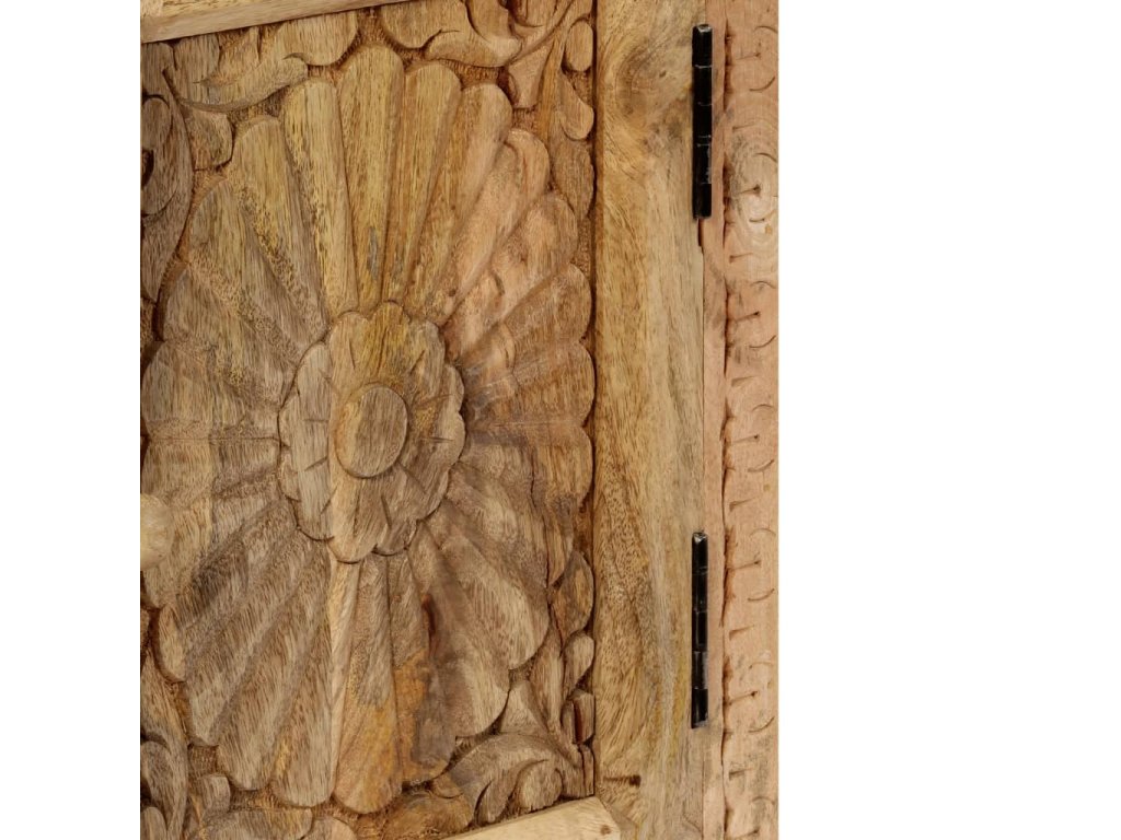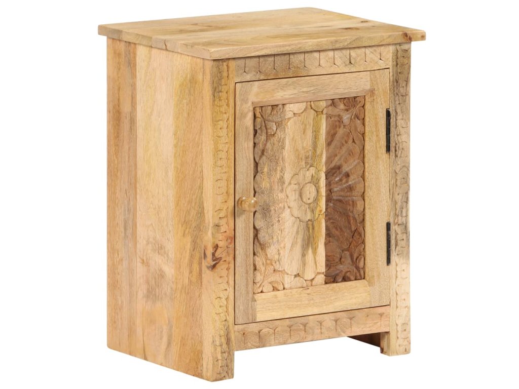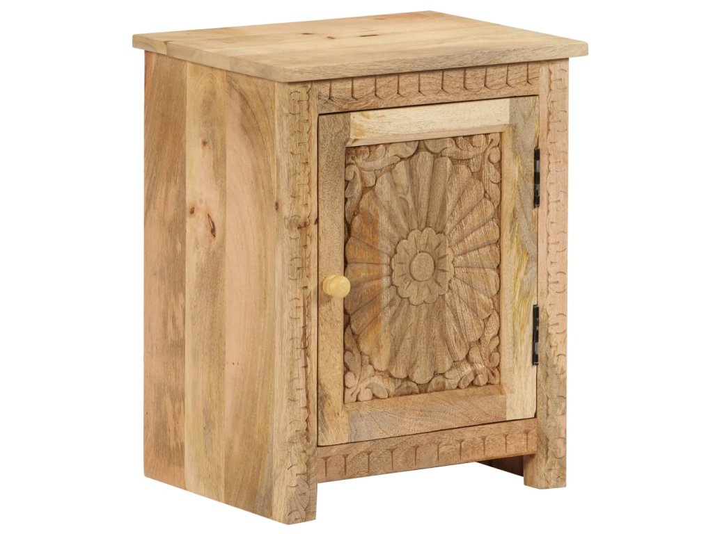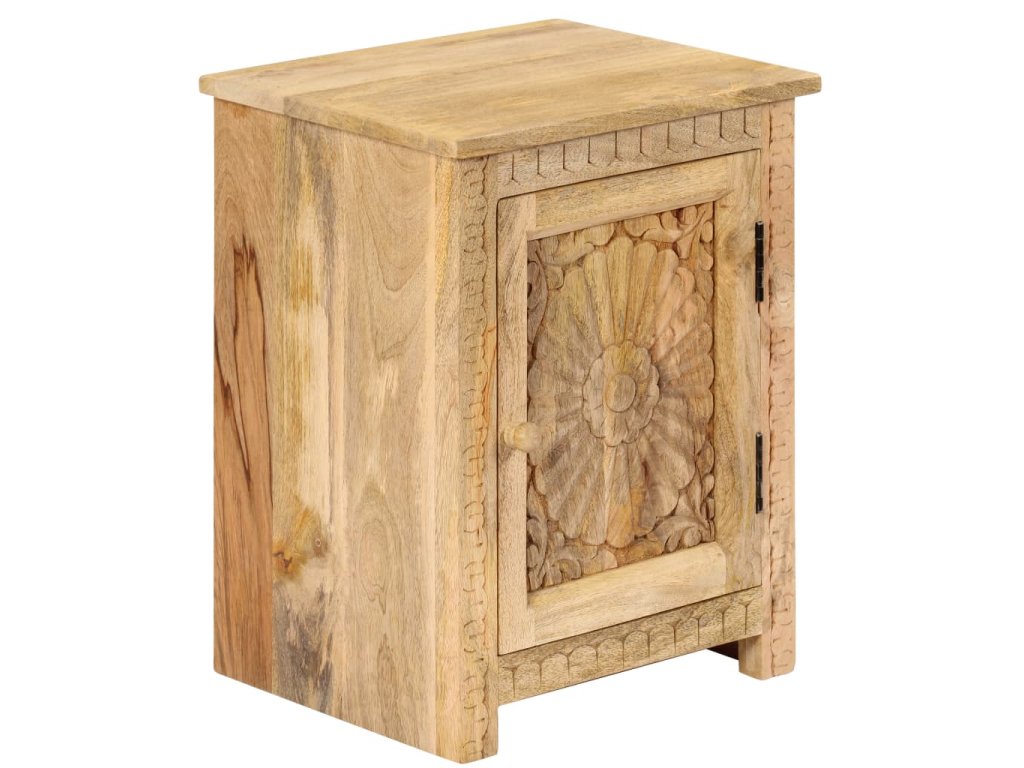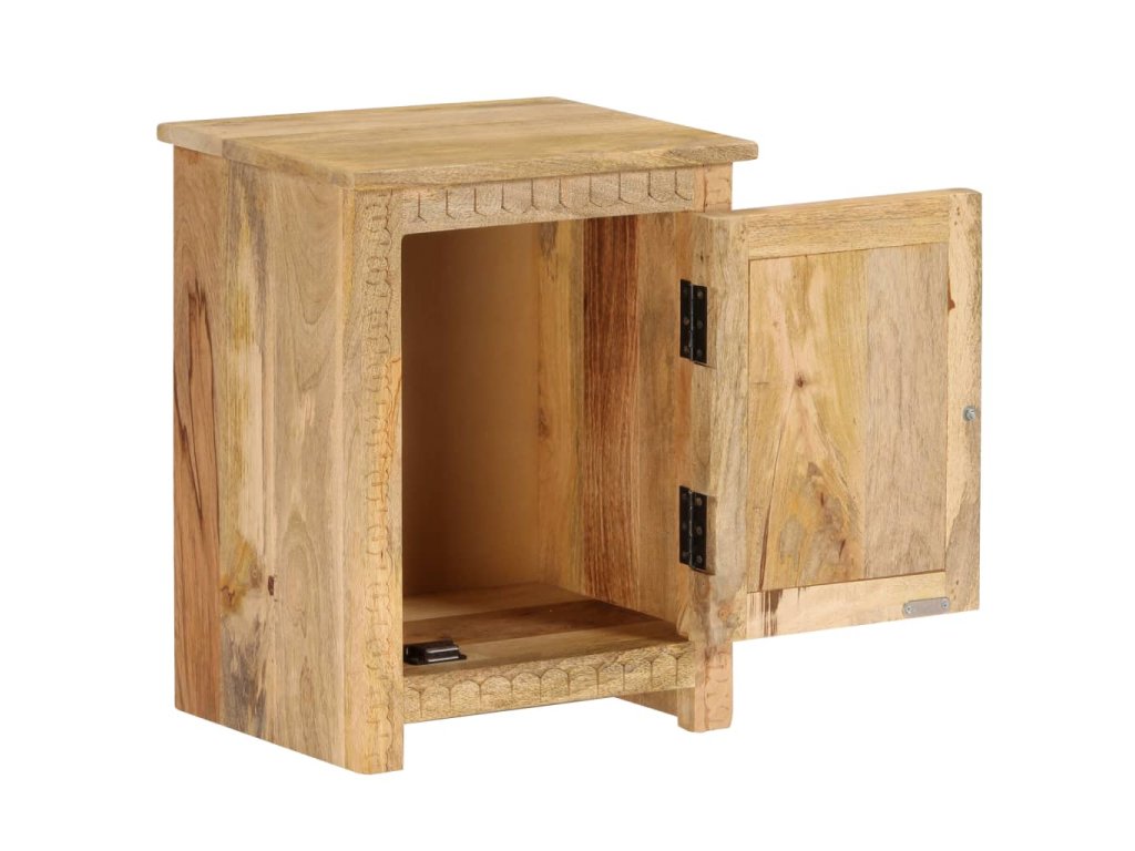 Odkládací stolek je vyroben z masivního mangovníkového dřeva a je vysoce stabilní a odolný. Pevná horní deska je ideální k odložení vašich sklenic, knih, šálků na čaj atd. Noční stolek poskytuje dostatek úložného prostoru pro úhledné uspořádání různých předmětů. Vyřezávané detaily dodávají nočnímu stolku nádech elegantního šarmu. Tento výrobek je dodávaný ve složeném stavu, montáž není nutná.