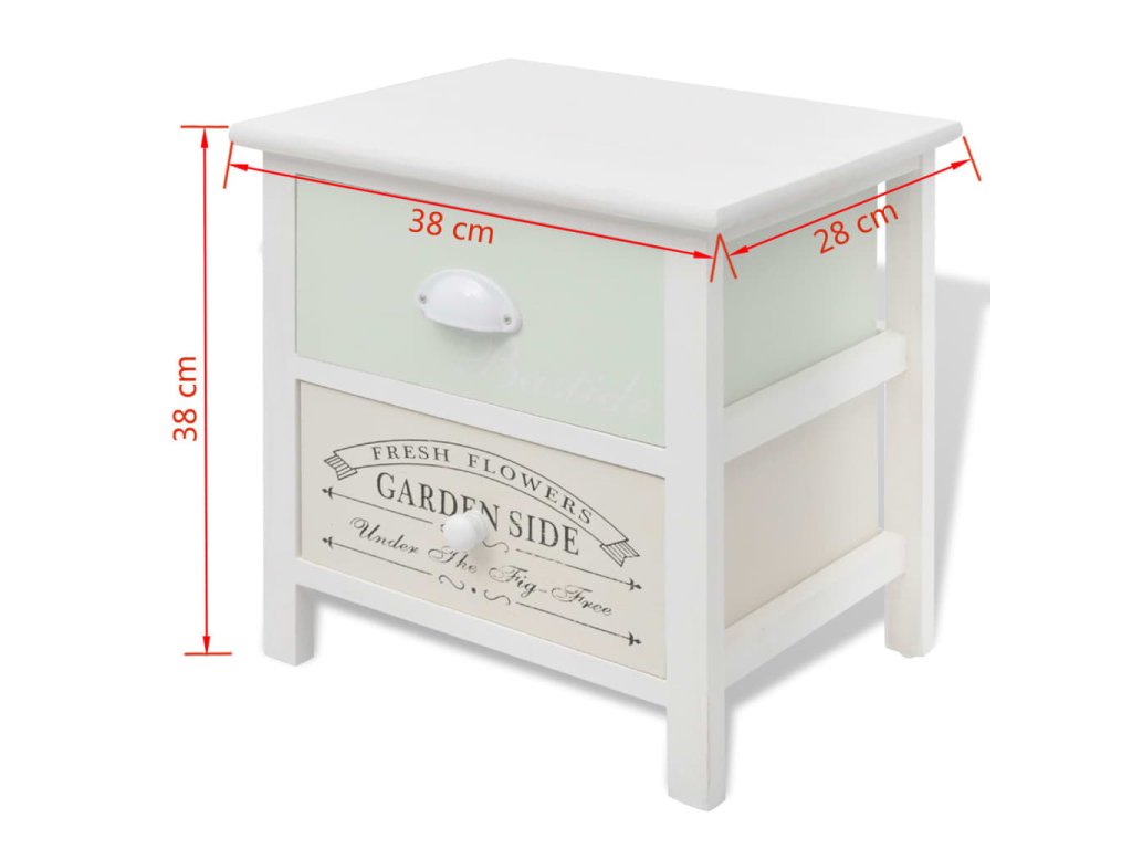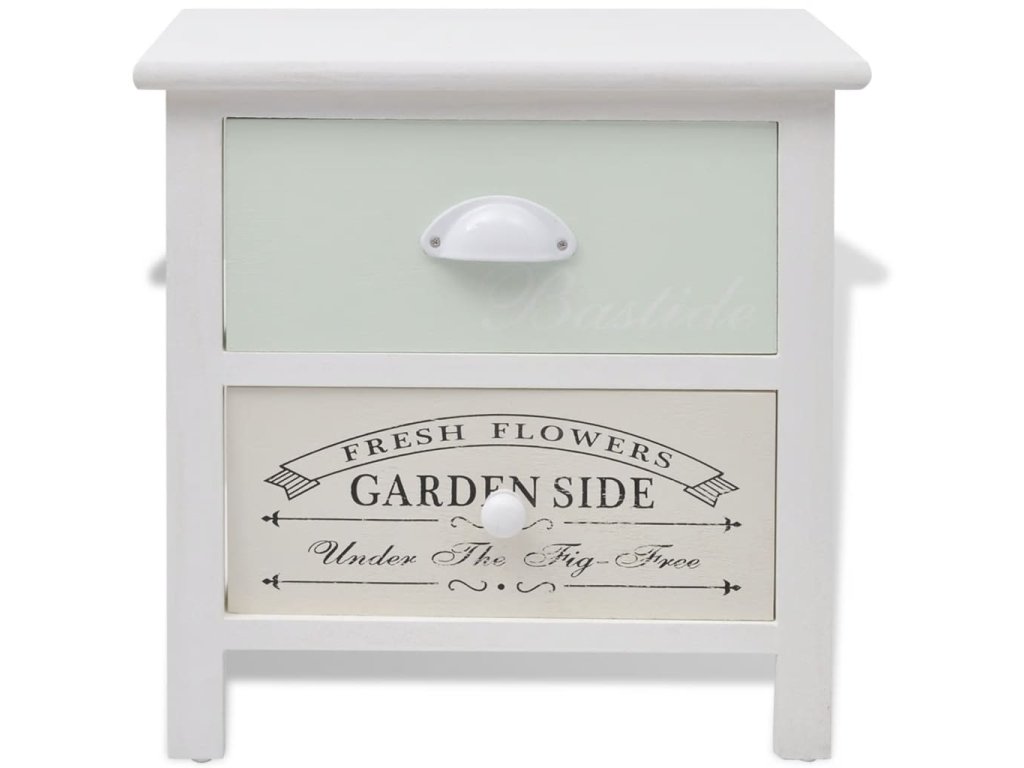 Tyto kompaktní noční stolky mají 2 hladce vysouvatelné šuplíky, které poskytují dostatek místa na vaše drobnosti, abyste je měli uspořádané a po ruce. Zásuvky s potisky ve vintage venkovském stylu dodávají stolkům rustikální ráz. Šuplíky se dají mezi sebou vyměňovat. Protože jsou vyrobené z vysoce kvalitních materiálů, jsou tyto stolky odolné a snadno se čistí.
