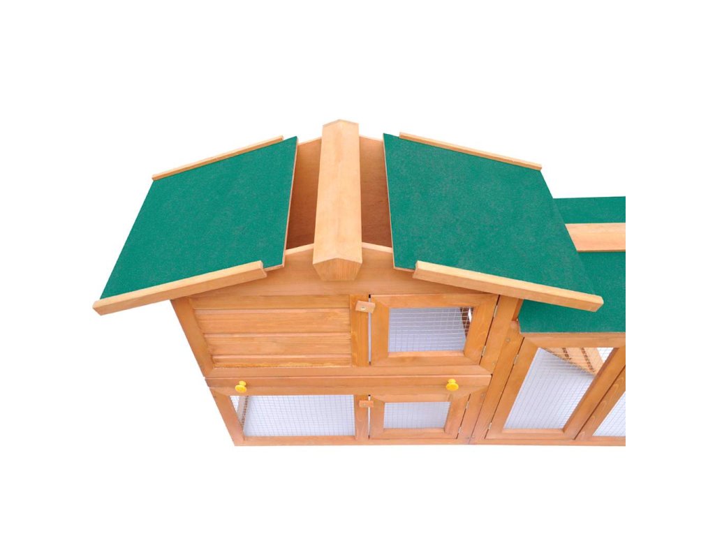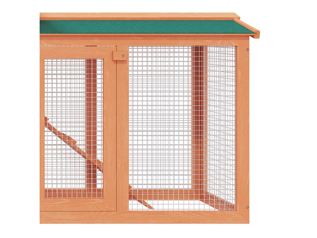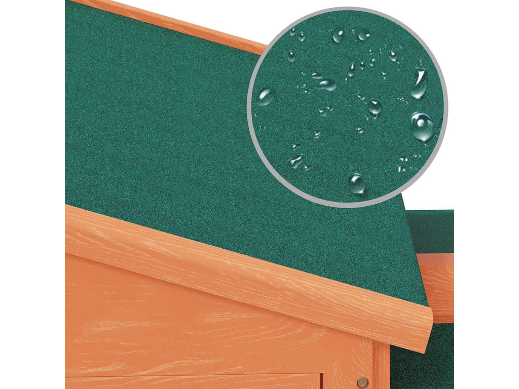 Králíkárna je vyrobena z vysoce kvalitního dřevěného rámu, takže poskytuje pevné a bezpečné přístřeší, které vydrží po celé roky. Její zelená střecha nepropouští déšť a útulný pelíšek uvnitř je skvělý na spaní. Z přízemí vede do patra nakloněná rampa, po které se dá snadno vylézt. Výsuvný zásobník usnadňuje čištění. Dvířka se snadno zavírají a dají se zajistit posuvnou západkou.