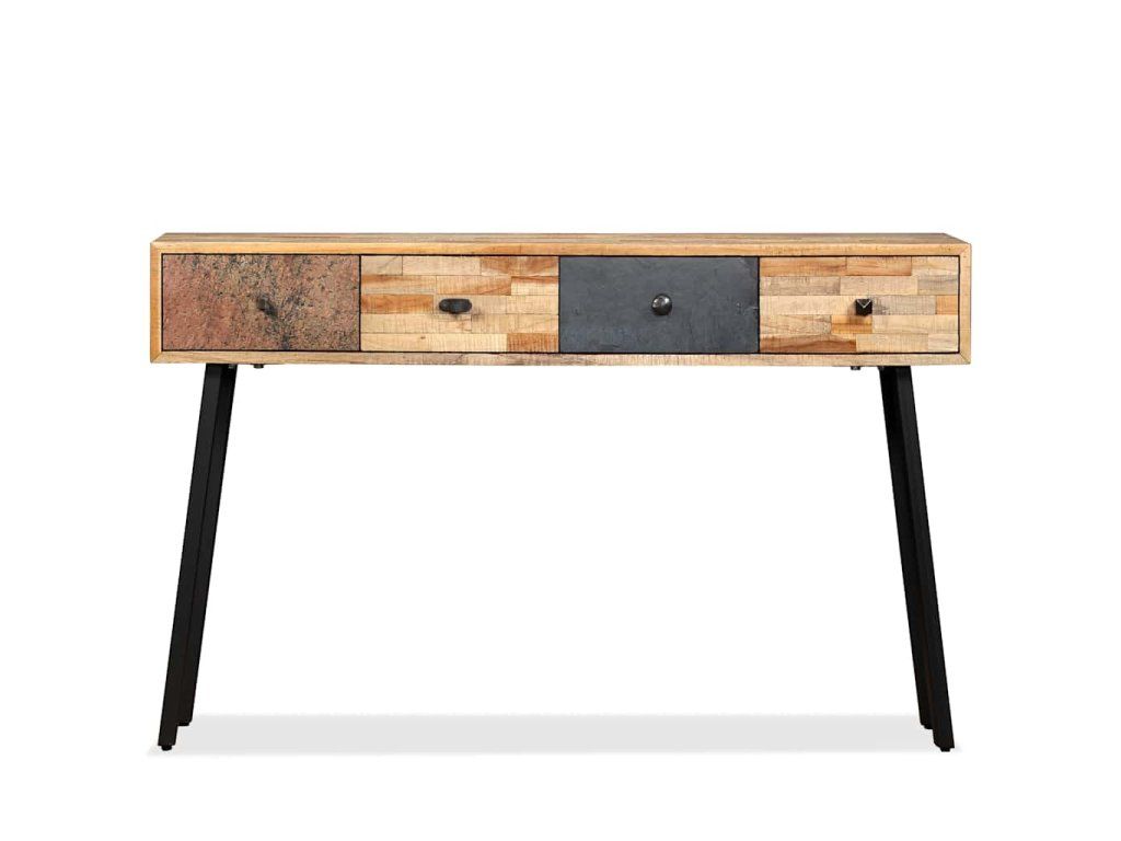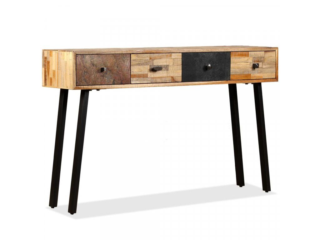 Odkládací stolek je vyroben z recyklovaného teaku, který je masivní, stabilní, odolný a krásný. Stolní deska z masivního dřeva poskytuje stabilní a bezpečnou plochu, na kterou můžete odkládat své nápoje, vázy, mísy s ovocem nebo dekorace, zatímco do jeho čtyř prostorných zásuvek můžete ukládat drobné předměty jako klíče, zápisníky, pera a další drobnosti. Mramorovaný povrch zásuvky zvyšuje jedinečnost a vintage styl stolu. Velká péče byla věnována všem krokům výrobního procesu, ať už je řeč o rekombinování, leštění, či lakování. Montáž je snadná.