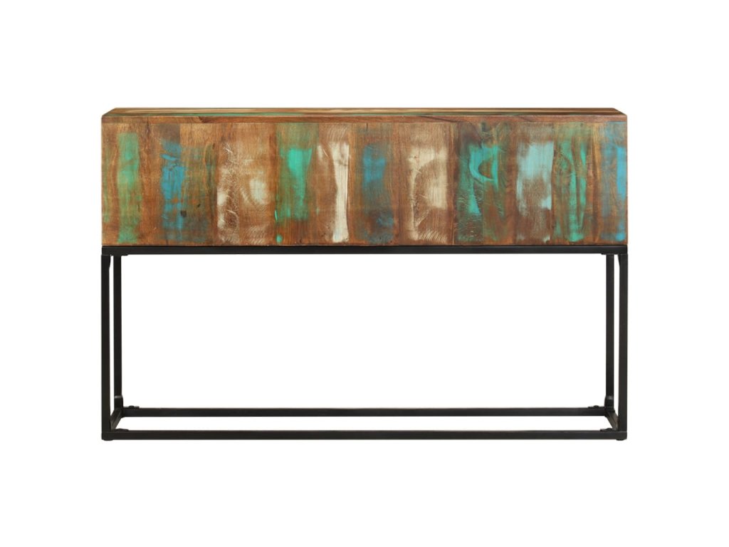 Stolek do předsíně je ručně vyroben z masivního recyklovaného dřeva, kombinace recyklovaných dřevin včetně teakového dřeva, mangovníkového dřeva, borovice, buku atd. Veškeré dřevo pochází ze starých továren, kůlen a lodí. Jedná se proto o mimořádně ekologický způsob výroby nábytku. Každý kus je výsledkem ruční práce a má rozmanité barvy, mezi kterými vystupuje mnoho modrých, zelených, krémových a někdy i oranžových, červených a růžových odstínů. Každý stolek je proto zcela jedinečný! Železné nohy s práškovým nástřikem podtrhují stabilitu stolku i jeho industriální kouzlo.