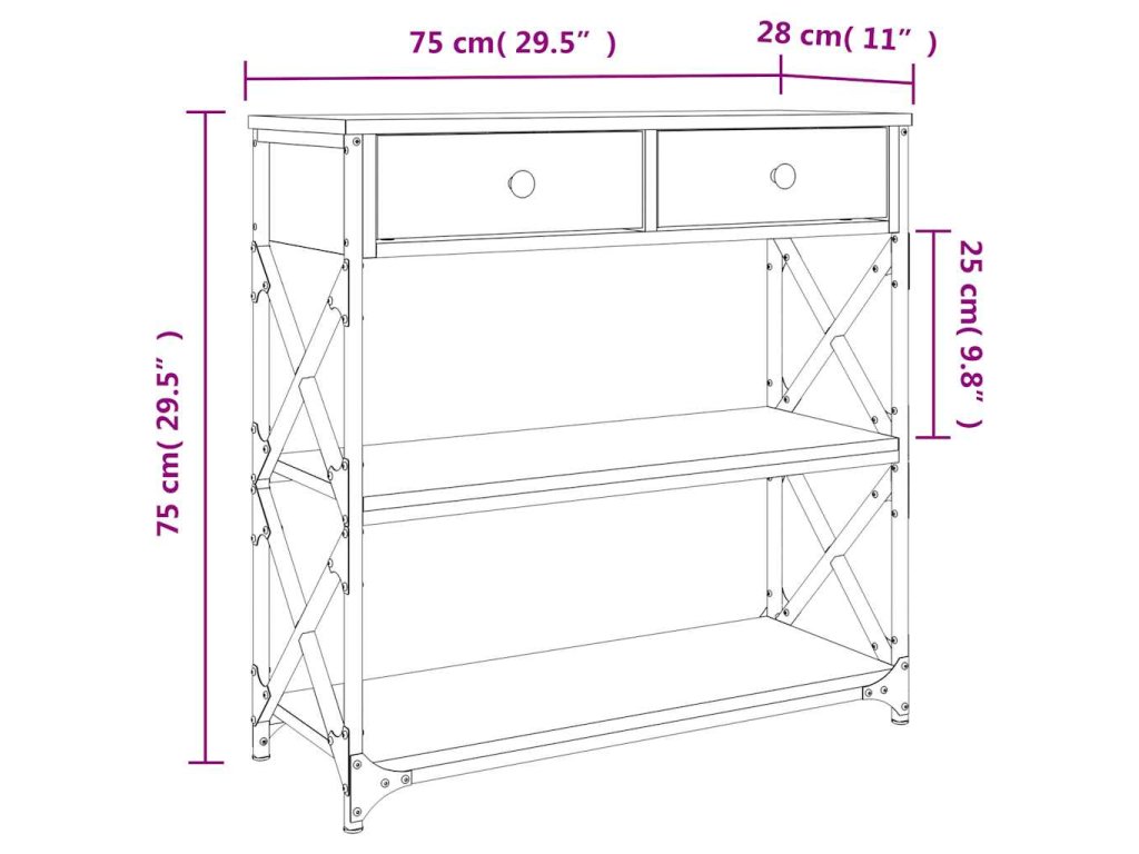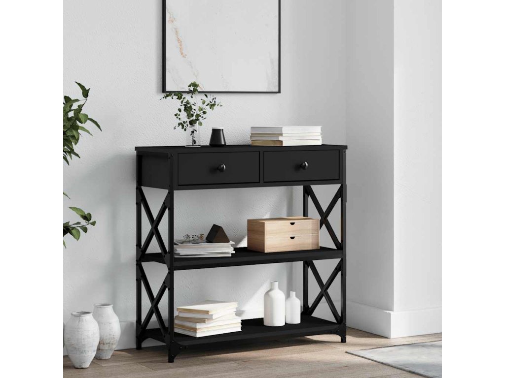 - Kovový rám: Kovový rám dodá vašemu interiéru industriální styl a zároveň zajistí výtečnou odolnost a stabilitu. Stolek do předsíně má příčky ve tvaru X pro větší stabilitu, takže se nemusíte obávat, že se bude viklat na podlaze.
