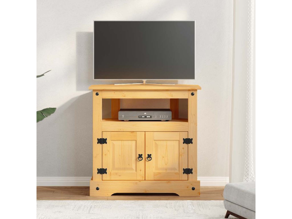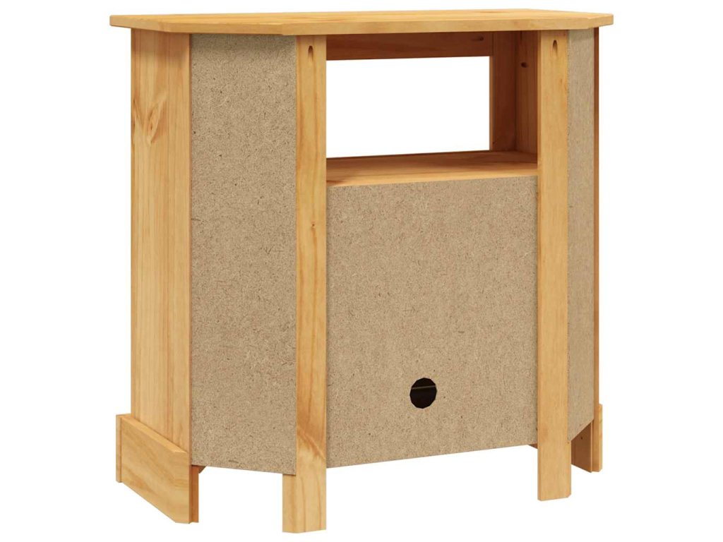 Pevná a bytelná skříňka je zhotovená z masivního borového dřeva. Má robustní horní desku, na kterou můžete umístit televizi nebo lampu, servírovat na ni jídlo a nápoje nebo si zde vystavit dekorativní předměty, jako jsou zarámované fotografie, koše s ovocem nebo vázy. Ve skříňce je jedna přihrádka s dvířky a jedna otevřená přihrádka, poskytuje tudíž dostatek prostoru pro přehledné ukládání knih, časopisů a dalších užitečných věcí. Stejně tak si do ní můžete uložit DVD přehrávače, herní konzole nebo streamovací zařízení. Zadní část je otevřená, abyste mohli skrýt veškeré kabely z dohledu.
