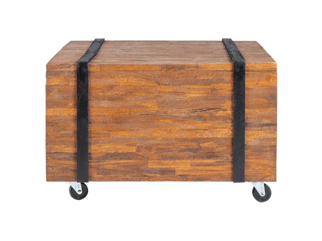 Náš odkládací stolek je vyroben z krásného tvrdého teaku, který mu propůjčuje pevnost. Je navržen tak, aby připomínal stoh trámů spojený černými pásy. Nabízí dostatek prostoru pro odkládání nápojů či pro umístění váz, květin, mísy s ovocem a dalších dekorativních předmětů. Povrchová úprava v přírodní barvě usnadňuje jeho čištění. Rustický stolek také disponuje čtyřmi kolečky, díky nímž se snadno přesouvá.