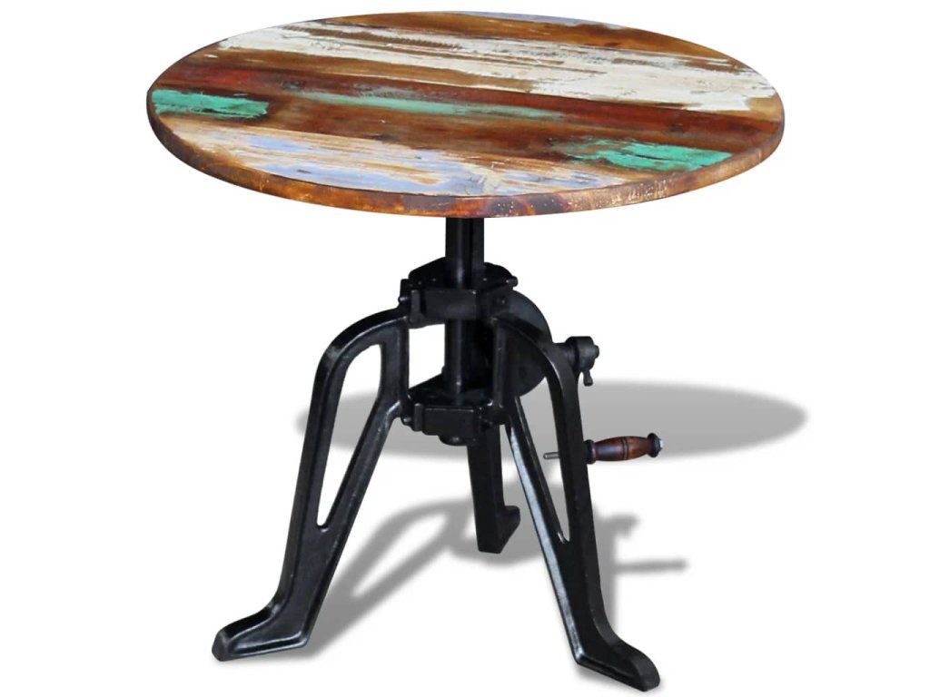 Tento retro dřevěný stolek z recyklovaného dřeva v industriálním stylu má nastavitelnou výšku mezi 42 a 63 cm a můžete ho používat také jako konferenční stolek, stolek ke gauči, do obývacího pokoje, na chodbu apod. Bude to stylový doplněk do vašeho interiéru. Nábytek má velmi pevnou a robustní litinovou základnu.