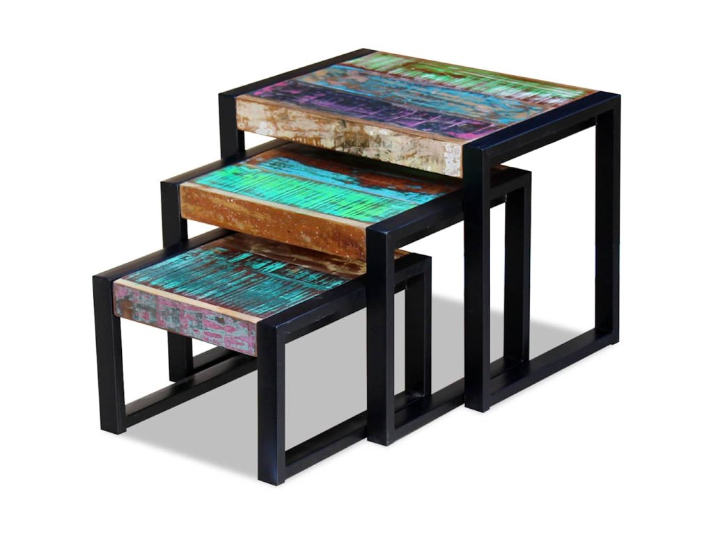 Tato vintage sada 3 stohovatelných stolků, vyrobených z masivního recyklovaného dřeva, bude nadčasovým doplňkem do vaší domácnosti. Dřevěné stolky se dají používat jako konferenční stolky, stolky ke gauči, stolky do obývacího pokoje, odkládací stolky, noční stolky, telefonní stolky apod. Díky svým pevným ocelovým rámům jsou tyto stolky velmi stabilní a odolné. Protože jsou stohovatelné, ušetří vám spoustu místa, když je zrovna nebudete používat.
