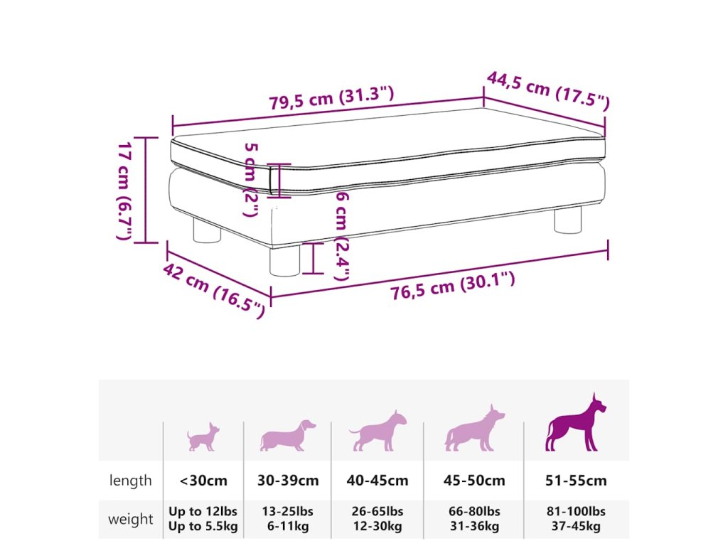 - Pevný a odolný rám: Rám z masivního borového dřeva zajišťuje robustnost a odolnost této pohovky pro psy. Čtyři nožičky jí navíc dodávají extra stabilitu.