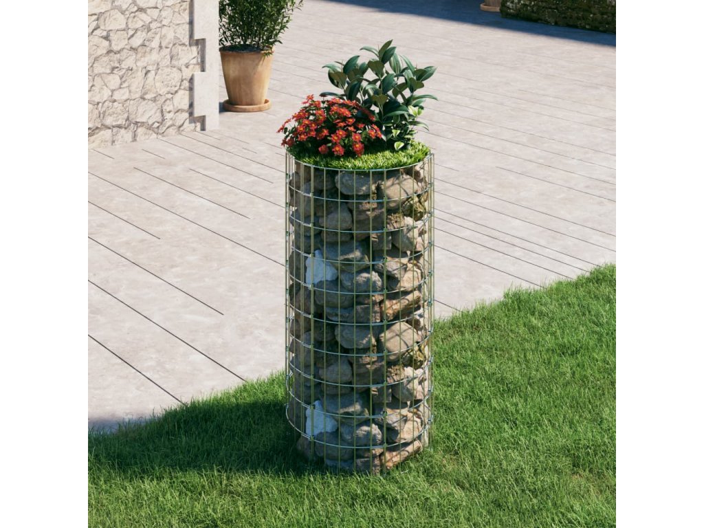 Tento kruhový gabionový sloupek představuje praktický způsob, jak vytvořit pevný okraj pro rostliny na vaší zahradě a terase.