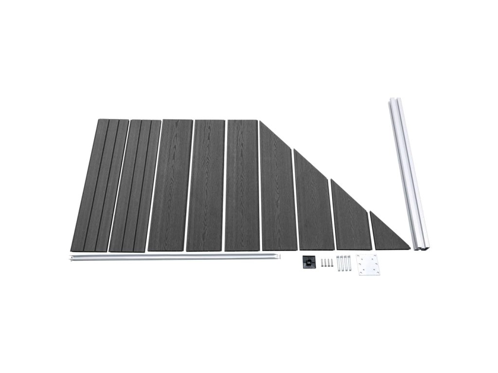- Materiál: WPC (dřevoplast), hliník, ocel