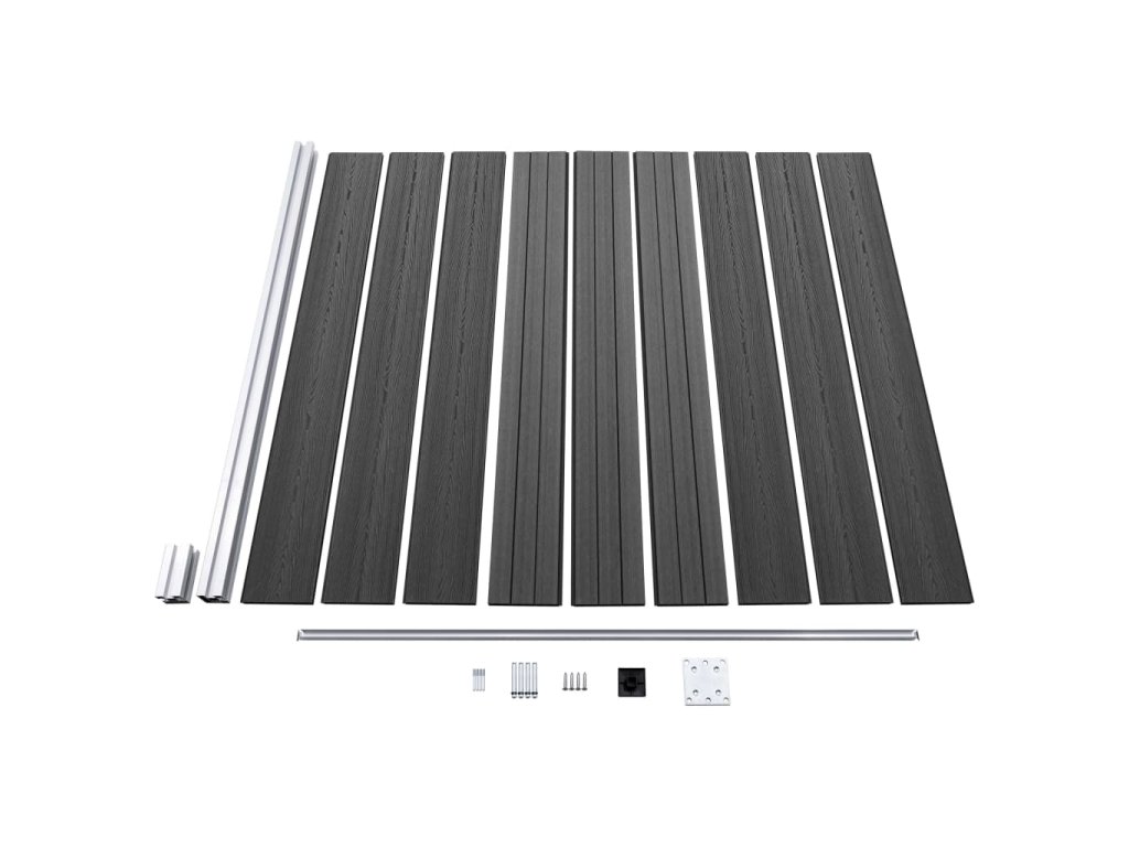 - Materiál: WPC (dřevoplast), hliník, ocel