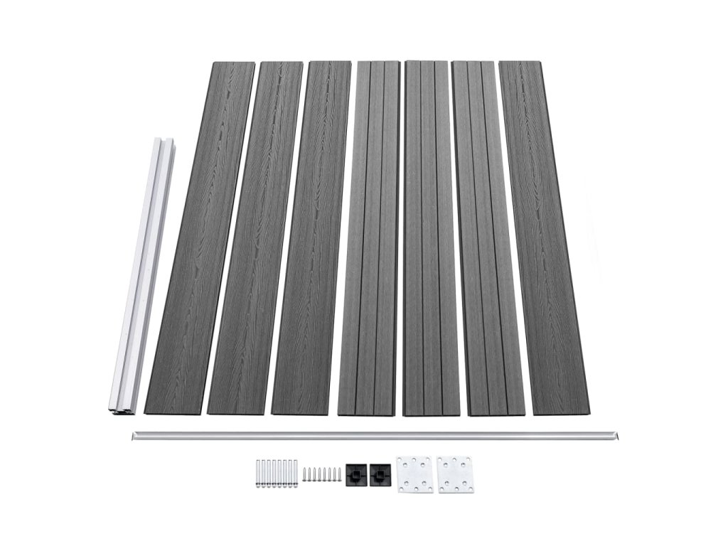- Materiál: WPC (dřevoplast), hliník, ocel
