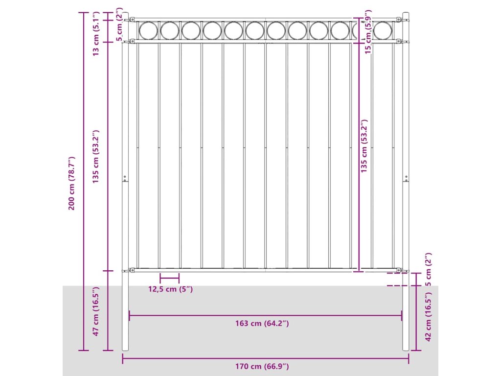 Náš okrajový plot poskytuje vysoký stupeň zabezpečení a soukromí díky elegantnímu kruhovému designu a silným vodorovným sloupkům pro zpevnění rámu. Venkovní plot, vyrobený z odolné práškově lakované oceli, je také velmi pevný, stabilní, robustní a odolný. Montážní materiál je součástí dodávky.