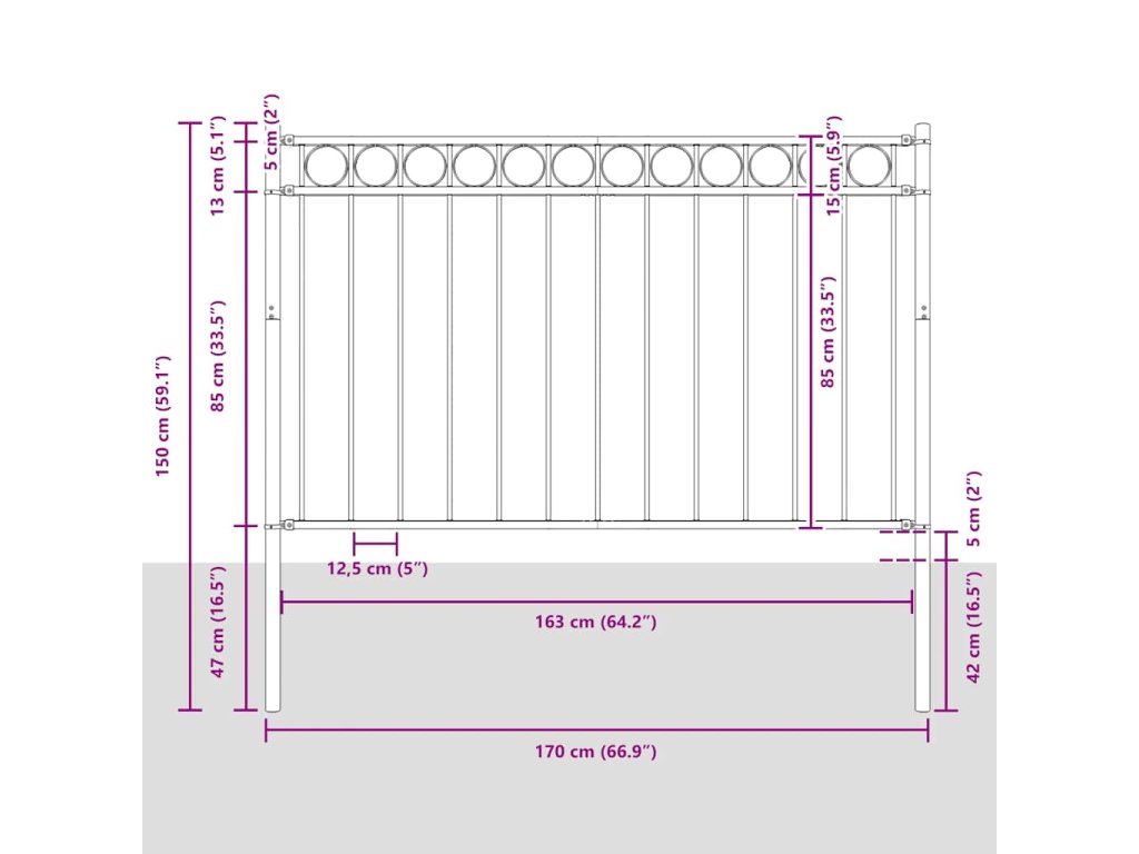 Náš okrajový plot poskytuje vysoký stupeň zabezpečení a soukromí díky elegantnímu kruhovému designu a silným vodorovným sloupkům pro zpevnění rámu. Venkovní plot, vyrobený z odolné práškově lakované oceli, je také velmi pevný, stabilní, robustní a odolný. Montážní materiál je součástí dodávky.