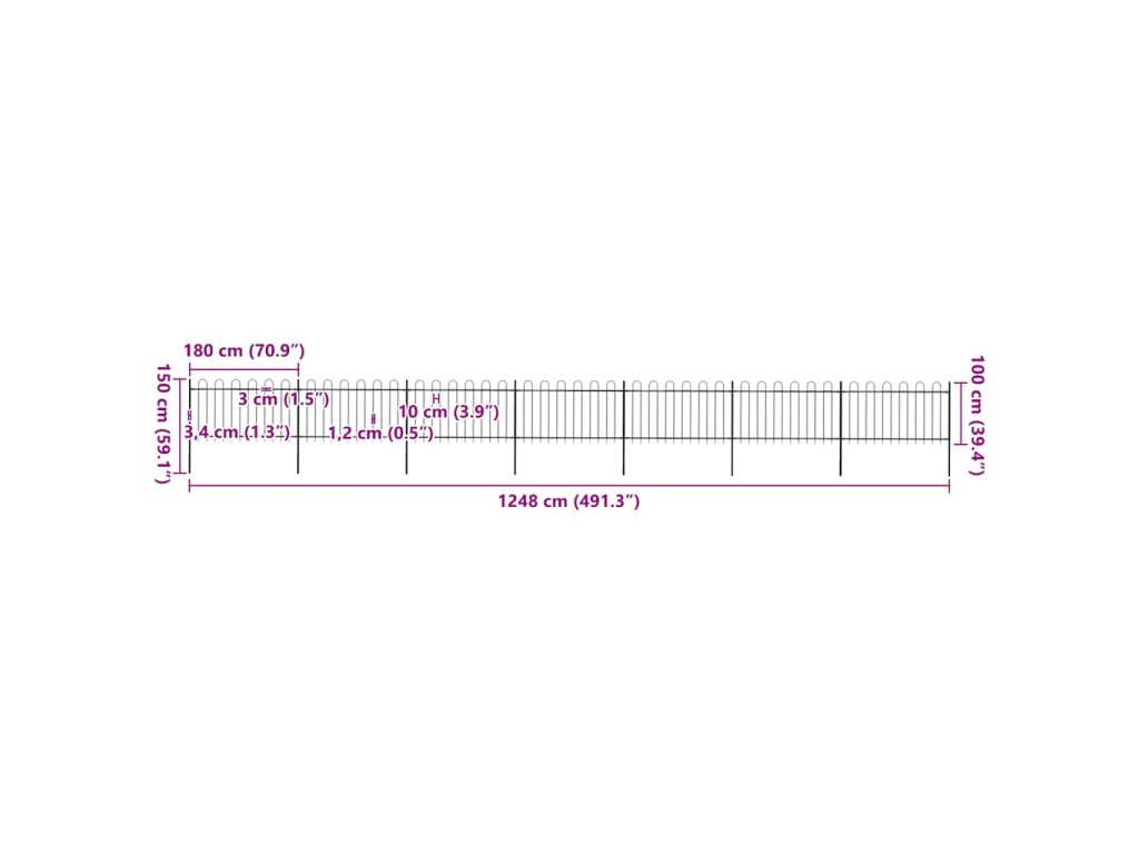Zahradní plot s obloukem nahoře ocelový 1248 x 100 cm černý 277662