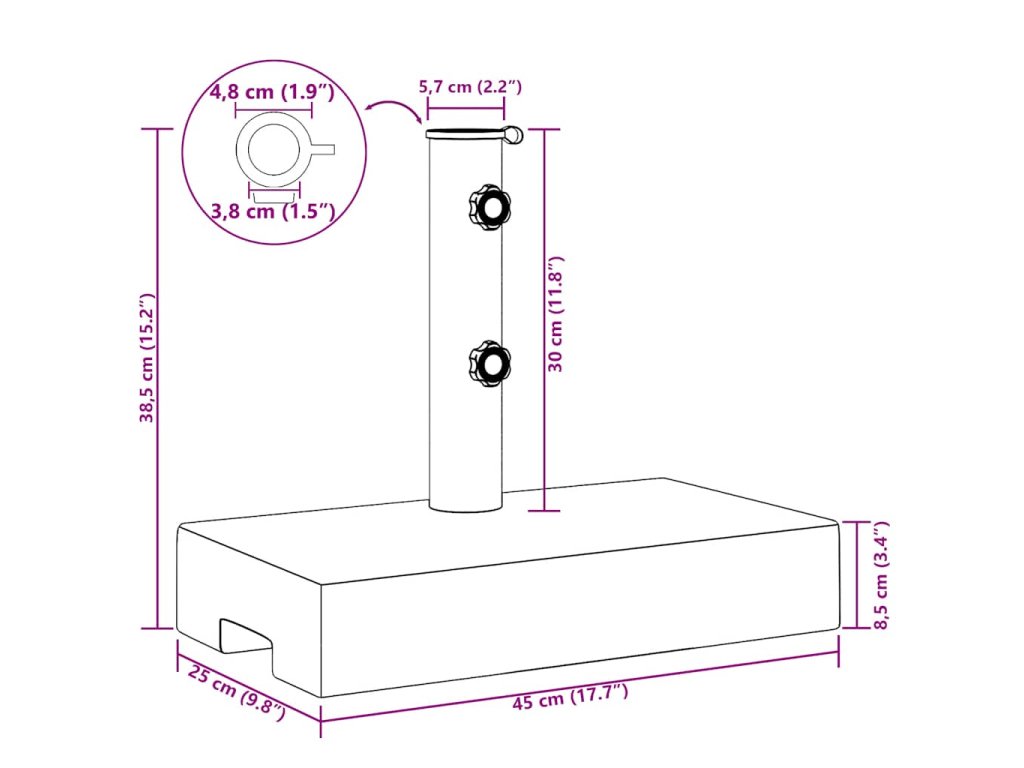 Základna tohoto stojanu na slunečník je vyrobena z odolné žulové konstrukce, která je díky své váze velmi stabilní. Žula je též vysoce kvalitní materiál s perfektním vzhledem a slunečníku tak přidá sofistikovaný vzhled. Zasaďte váš slunečník do tohoto luxusního stojanu a dodejte svému venkovnímu zahradnímu posezení dotek elegance a luxusu. Trubka na slunečník je zhotovená z nerezové oceli.