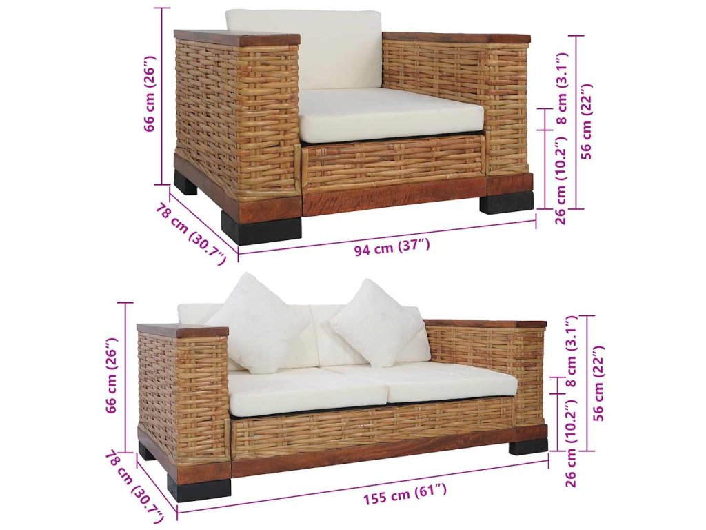 Souprava je vyrobena z pravého ratanu, je tudíž odolná, skvěle se hodí pro každodenní použití a zároveň se snadno čistí. Má robustní dřevěný rám, který se vyznačuje dlouhou životností a mimořádnou stabilitou. Tlusté podušky na sedák a na opěradlo se výborně přizpůsobí vašemu tělu a jejich snímatelné potahy se dají prát. Široké područky rovněž přispívají k pohodlnému posezení.