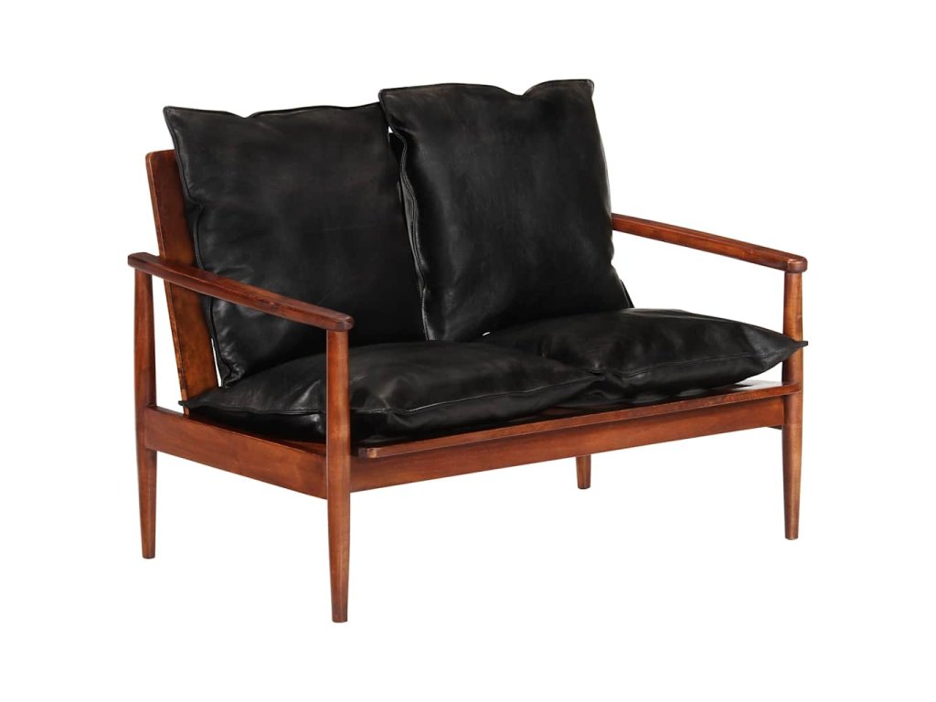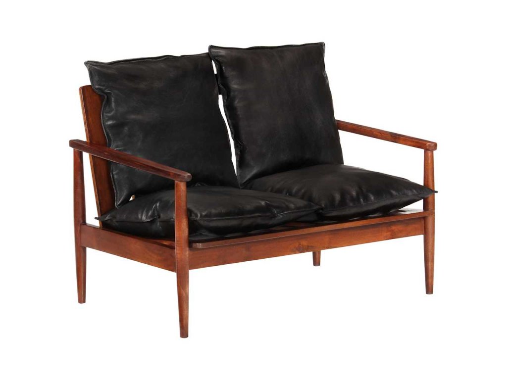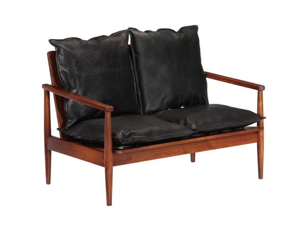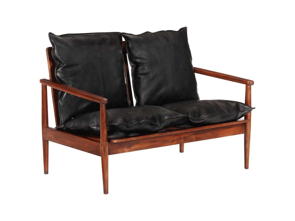 2místná pohovka černá pravá kůže a masivní akáciové dřevo 340924