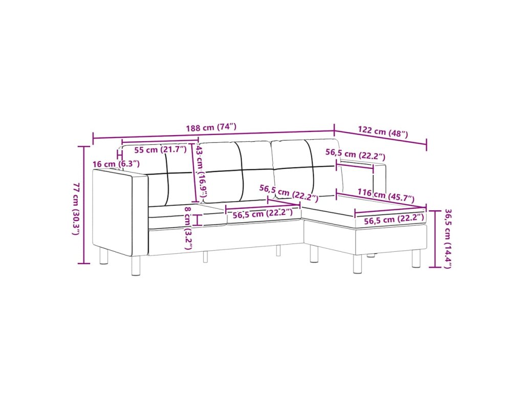 - Balení obsahuje : 1 x sedačka ve tvaru písmene L, 3 x polštář a 3 x poduška