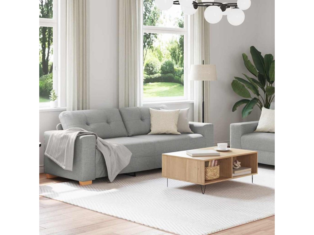 - Materiály: Tento pohovkový set je potažen látkou s polyesterovými opěradly a polštáři. Prodyšná látka vás udrží v pohodě, zatímco polyester dodává odolnost. Vypadá skvěle a hodí se do různých interiérů. Navíc jeho robustní konstrukce znamená dlouhou životnost, takže bude vypadat skvěle i po čase.