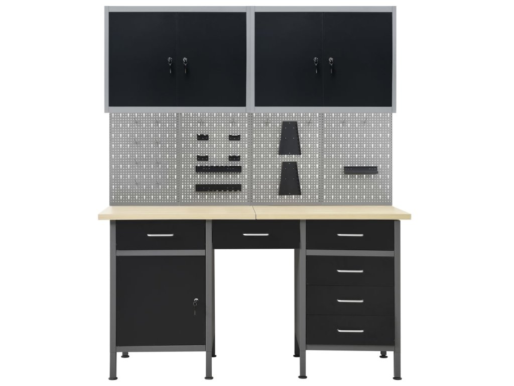 Tato dílenská sada 1 pracovního stolu se 4 nástěnnými panely a 2 nástěnnými skříňkami je praktické úložné řešení pro vaši dílnu a garáž.