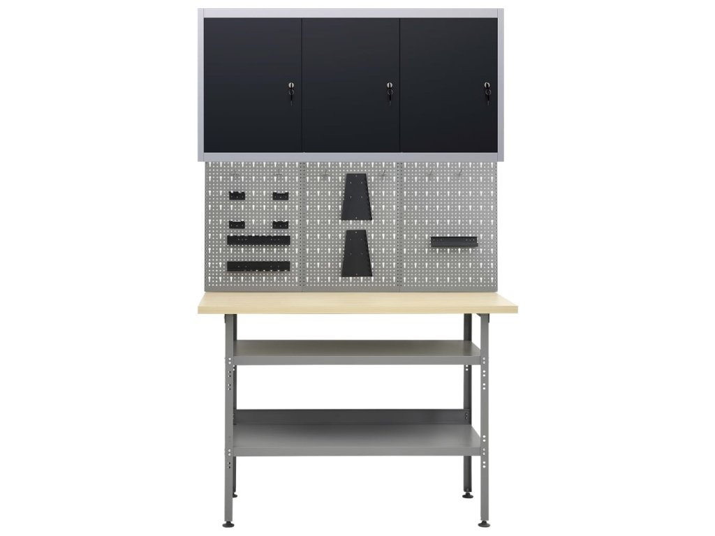 Tato dílenská sada 1 pracovního stolu se 3 nástěnnými panely a 1 nástěnnou skříňkou je praktické úložné řešení pro vaši dílnu a garáž.