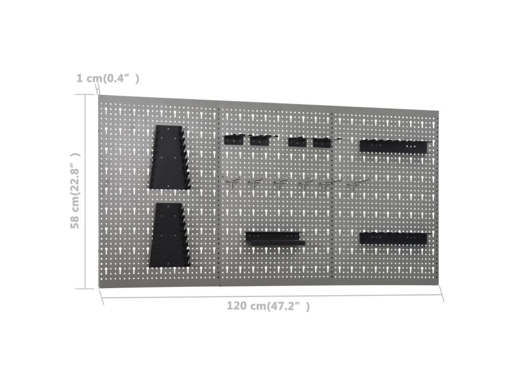 Tyto panely do dílny na nářadí jsou vyrobené z masivní oceli a unesou váhu celé řady různých nástrojů, jako jsou vrtačky, kleště, šroubováky a klíče. Panely jsou děrované pro snadné a bezpečné zavěšení nástrojů. Tyto 3 nástěnné panely je možné spojit dohromady a vytvořit jeden velmi pevný celek. Je to ideální doplněk ponků a dílenských skříní s praktickou šířkou 120 cm.