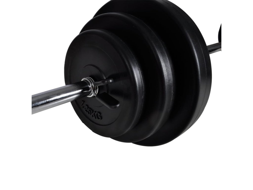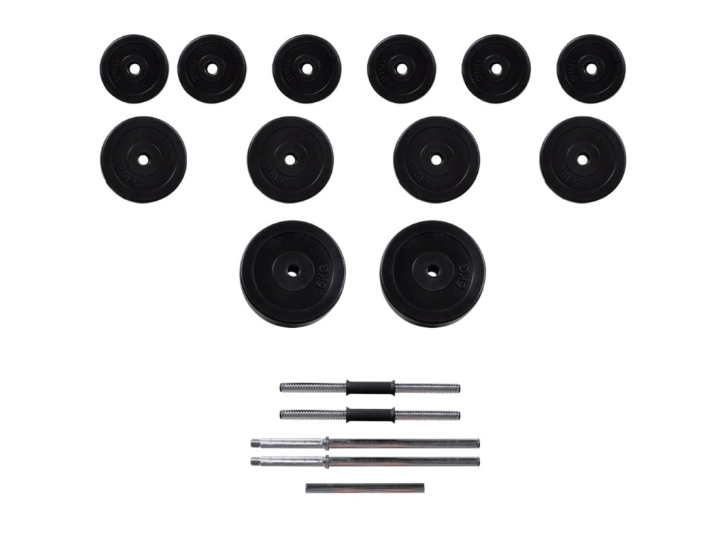 Sada činek barbell a dumbbell obsahuje silné pochromované činkové tyče s rychloupínacími pružinovými objímkami (pro tyč barbell), neklouzavé rukojeti a vroubkované hvězdicové uzávěry (pro tyče dumbbell), které zajišťují bezpečné upevnění zátěžových kotoučů. Můžete tak cvičit bez obav o vaše bezpečí. Zátěžové kotouče jsou vyrobeny s robustním vrchním pláštěm z polyetylenu. Dají se kombinovat různými způsoby tak, aby vyhovovaly různým tréninkovým účelům.