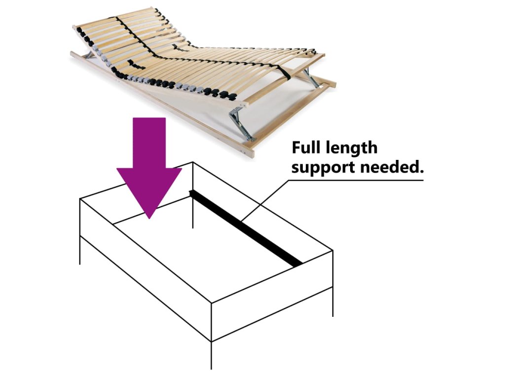 Rošt postele je díky rámu z masivního bukového dřeva a březovým lamelám pevný a odolný. Sedm komfortních zón poskytuje optimální podporu vašemu tělu. Oba konce lamel jsou drženy na místě gumovými uzávěry SBS pro lepší stabilitu celé konstrukce. Pevnost roštu si můžete přizpůsobit vašim potřebám díky 4 nastavitelným dvojitým lamelám ve středové zóně. Oblasti pod hlavou i pod nohama jsou nastavitelné, takže si můžete pohodlně číst nebo sledovat televizi. Montáž je snadná.