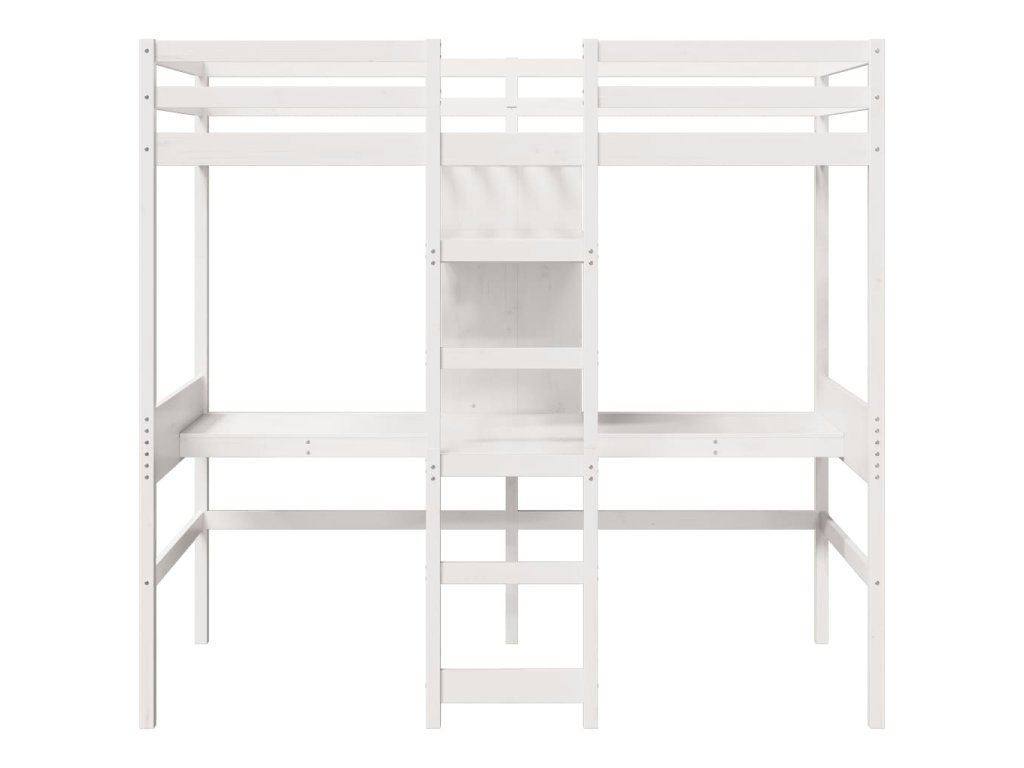 Tato všestranná patrová postel kombinuje jednolůžko s psacími stoly a policemi, takže poskytuje útulný prostor na spaní, prostornou pracovní plochu a šikovné úložné řešení. Je ideální volbou pro domácnosti s omezeným prostorem.