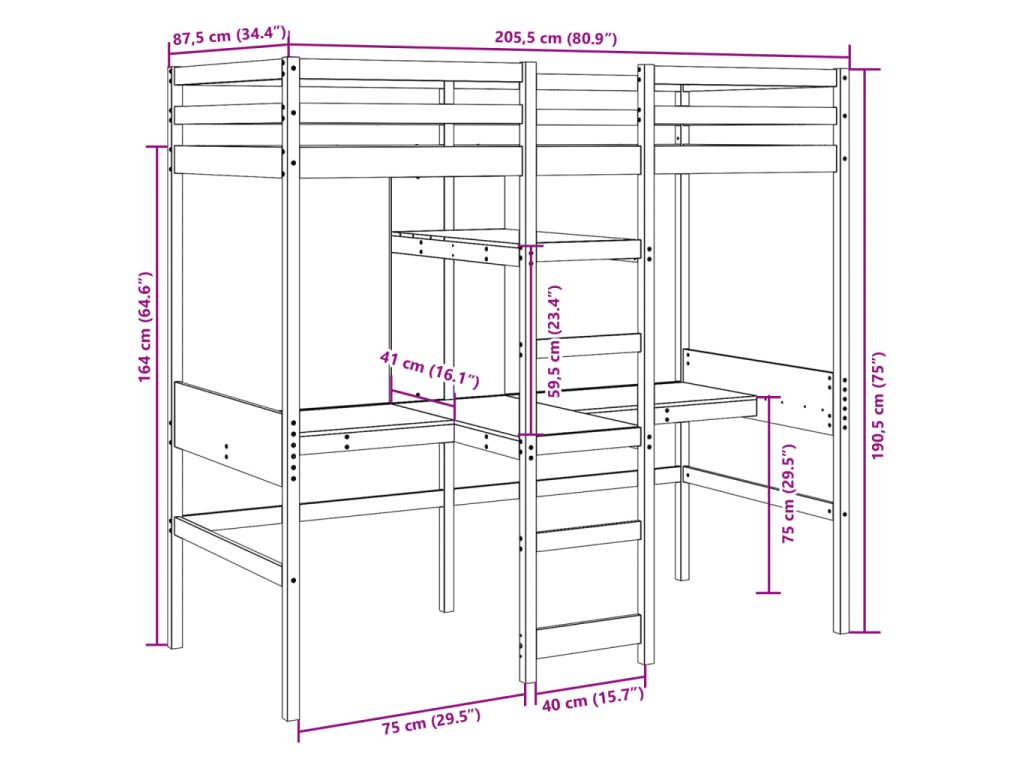 Tato všestranná patrová postel kombinuje jednolůžko s psacími stoly a policemi, takže poskytuje útulný prostor na spaní, prostornou pracovní plochu a šikovné úložné řešení. Je ideální volbou pro domácnosti s omezeným prostorem.