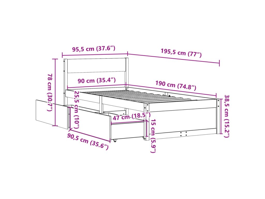 - Rozměry zásuvky pod postel: 90,5 x 47 x 25,5 cm (D x Š x V)