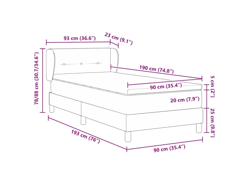 - Velikost matrace: Krátké jednolůžko (90 cm x 190 cm nebo 35" x 75")