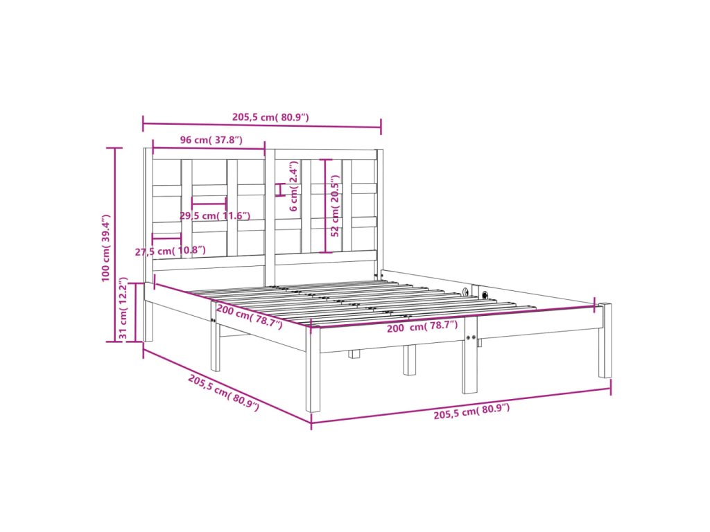 - Rozměry rámu postele: 205,5 x 205,5 x 31 cm (D x Š x V)