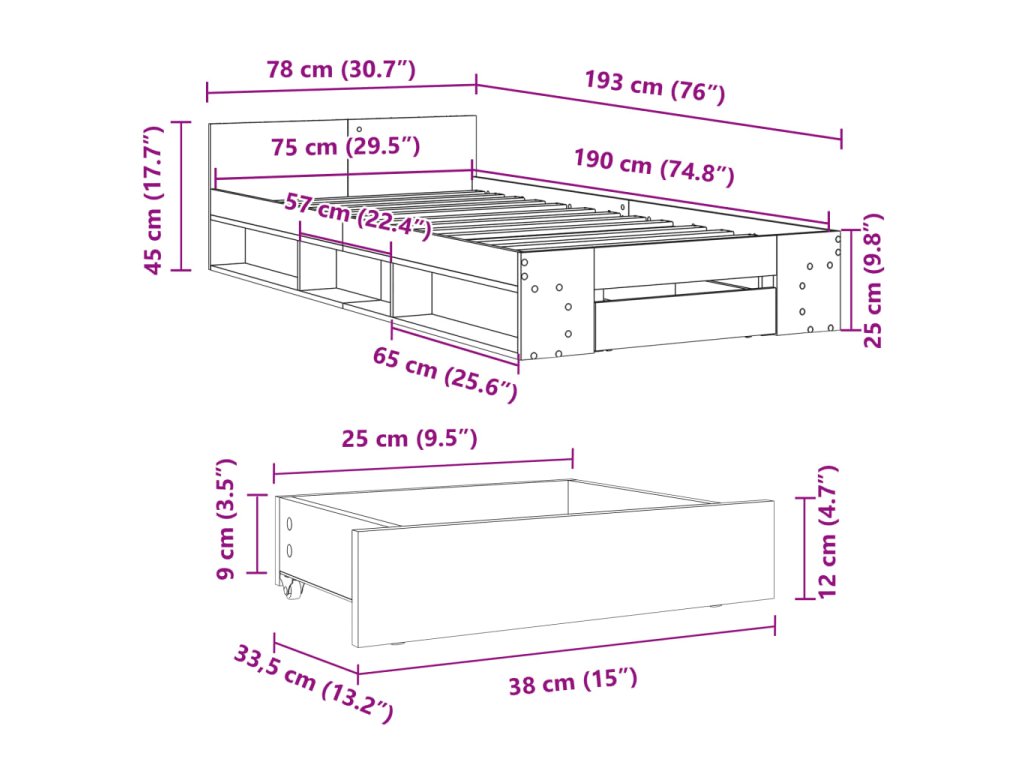 Rám postele se zásuvkou betonově šedý 75x190cm kompozitní dřevo 3280807