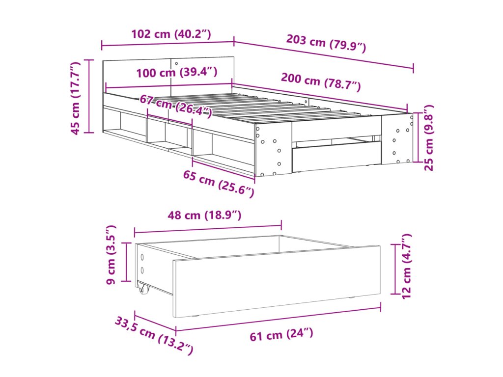 - Rozměry zásuvky pod postel: 61 x 33,5 x 12 cm (D x Š x V)