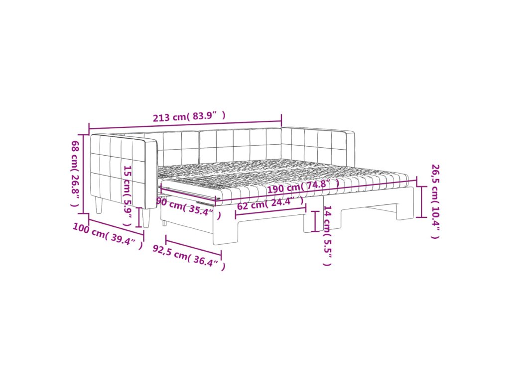 - Rozměry (nevysunuté): 213 x 100 x 68 cm (D x Š x V)