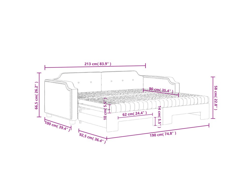 - Rozměry (nevysunuté): 213 x 100 x 66,5 cm (D x Š x V)